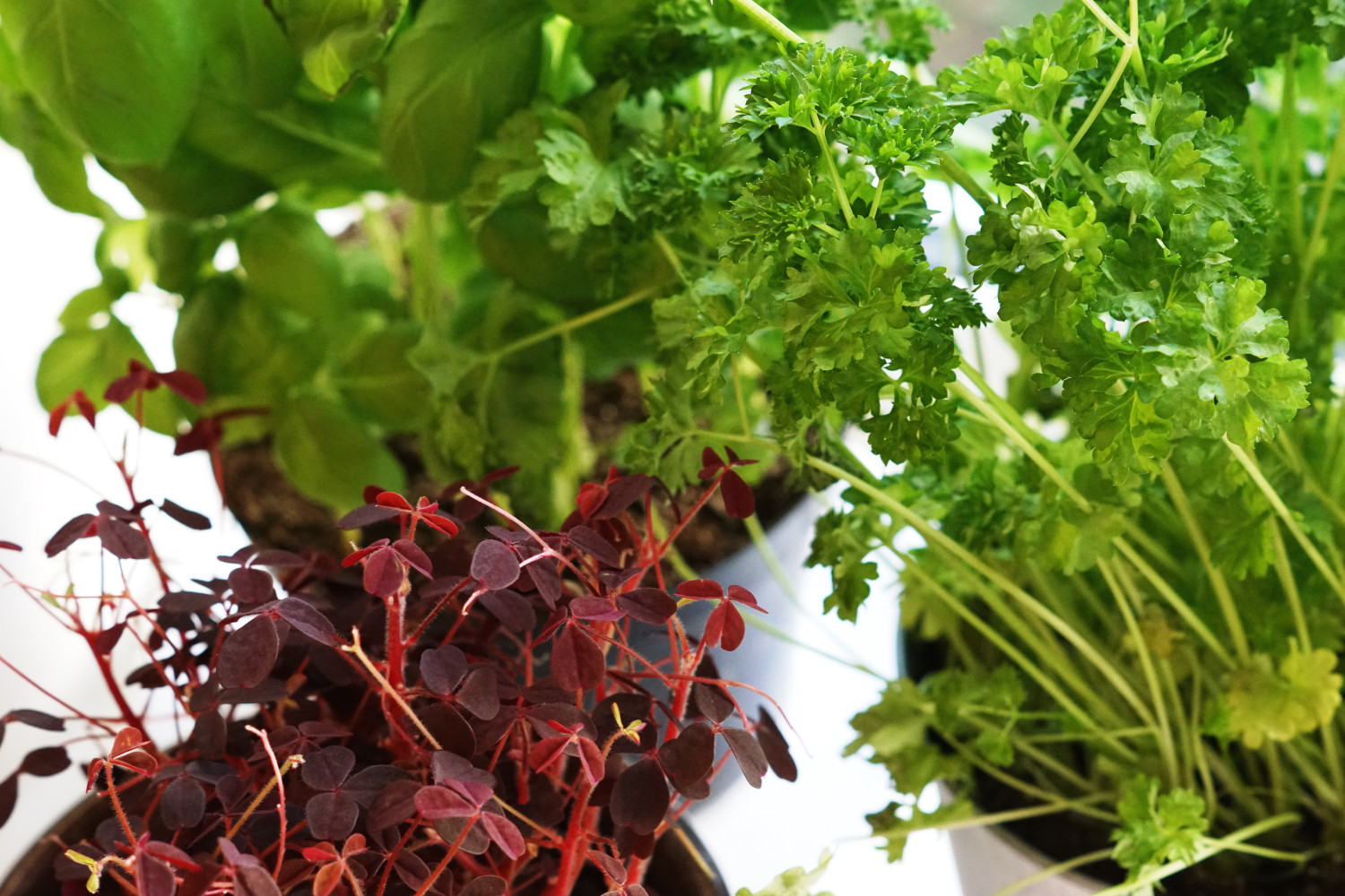 Min vindueskarm er altid fyldt med friske krydderurter, som jeg bruger i stort set alle måltider. Til morgenmad elsker min mand ristet toast med spejlæg og her kommer jeg altid masser af frisk persille på. Skovsyre er lækkert ovenpå yoghurt eller som pynt på en smoothie (eller på kager!).