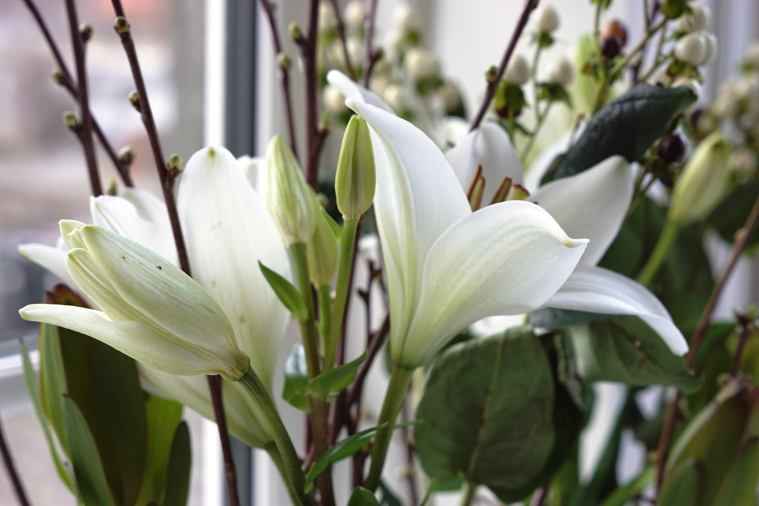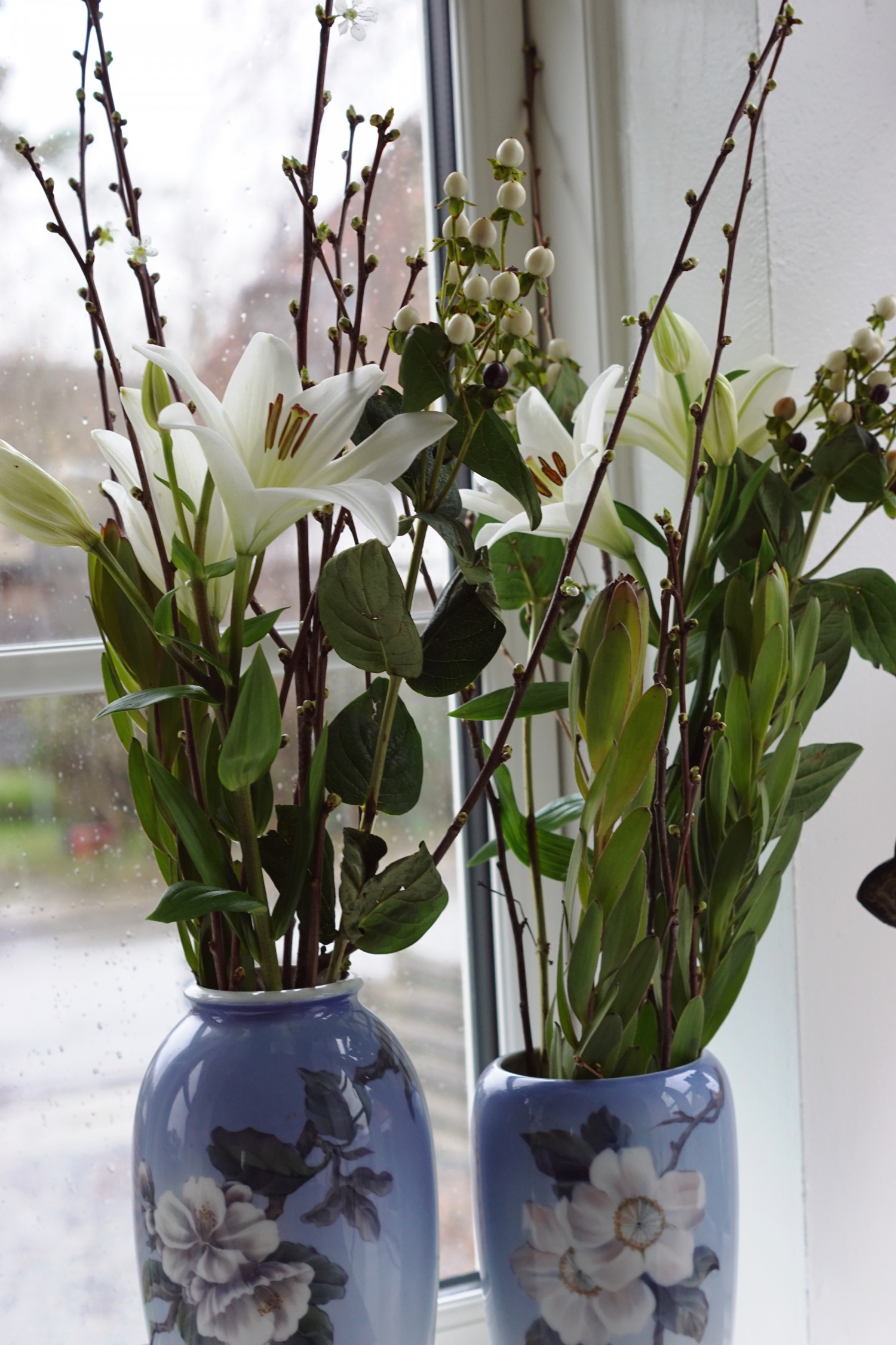 I weekenden sprang liljerne i vindueskarmen i den ene stue også ud. Du finder link til buketten med pilegrene og liljer lige her. Den buket har altså stået i 12 dage (jeg har skiftet vandet et par gange) og da liljerne blev trætte tog jeg dem fra buketten og hældte vandet væk. Nu får buketten lov at stå og tørre og på den måde pynte lidt endnu.