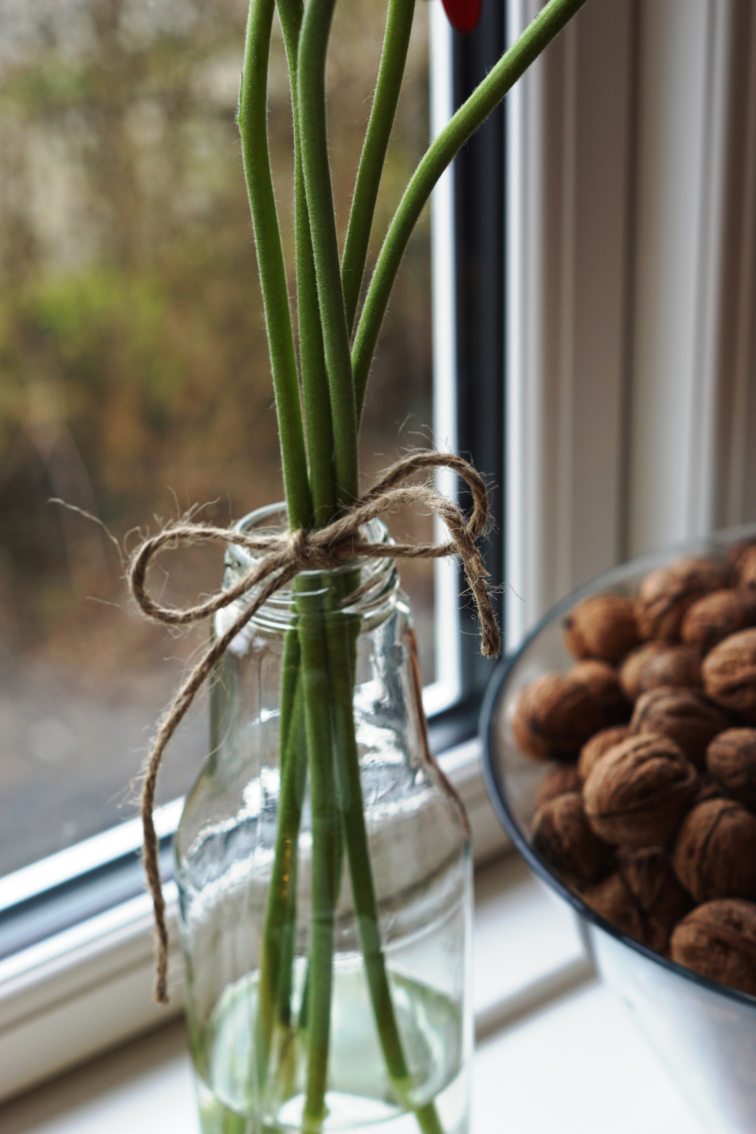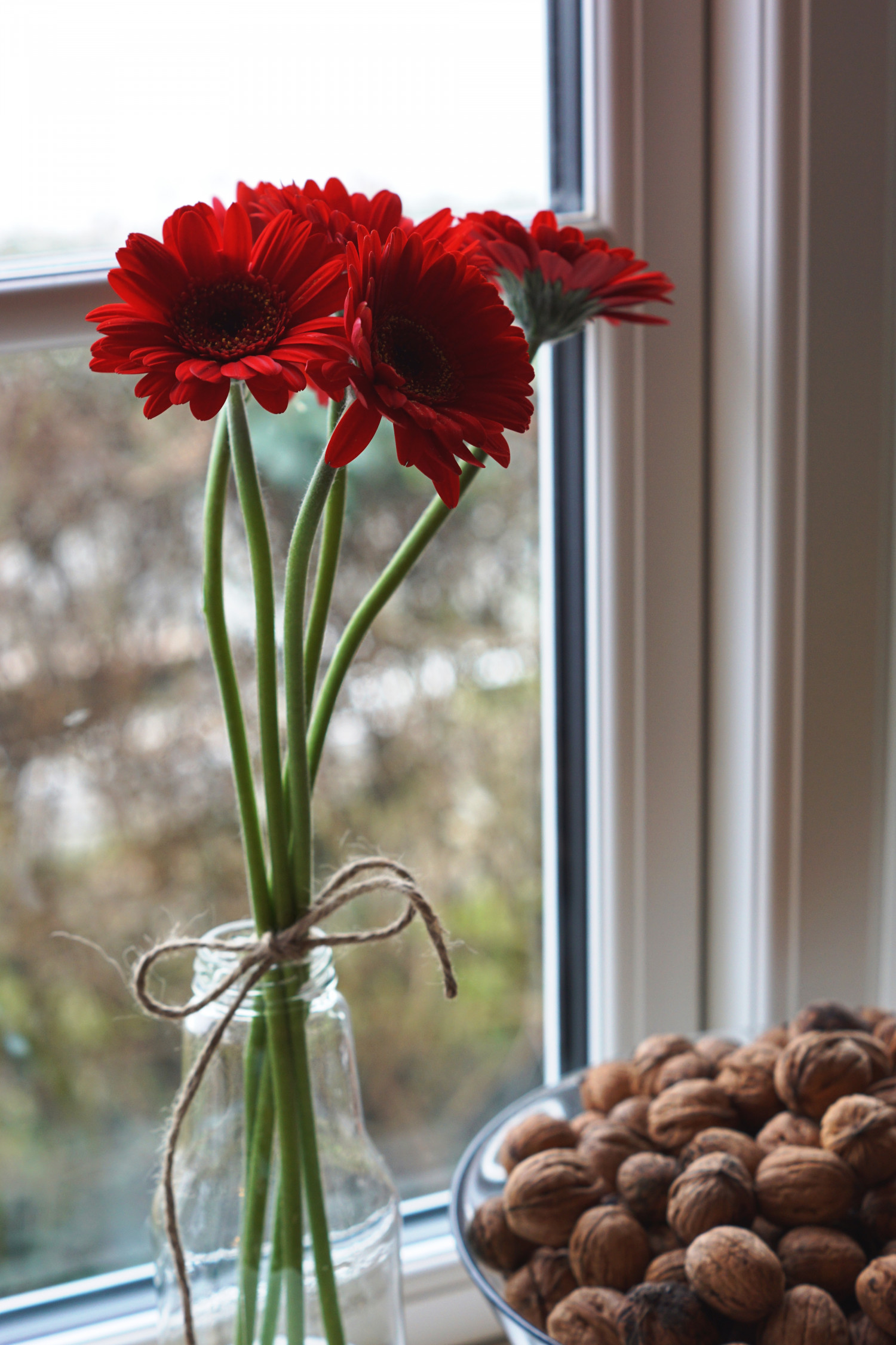 I weekenden købte jeg disse smukke gerbera for kun 10 kroner i supermarkedet og arrangerede dem med lidt blomstersnor omkring – bundet i en sløjfe for at holde stilkene sammen – og ned i en gammel, renset glasflaske som der vistnok har været æblemost i engang.