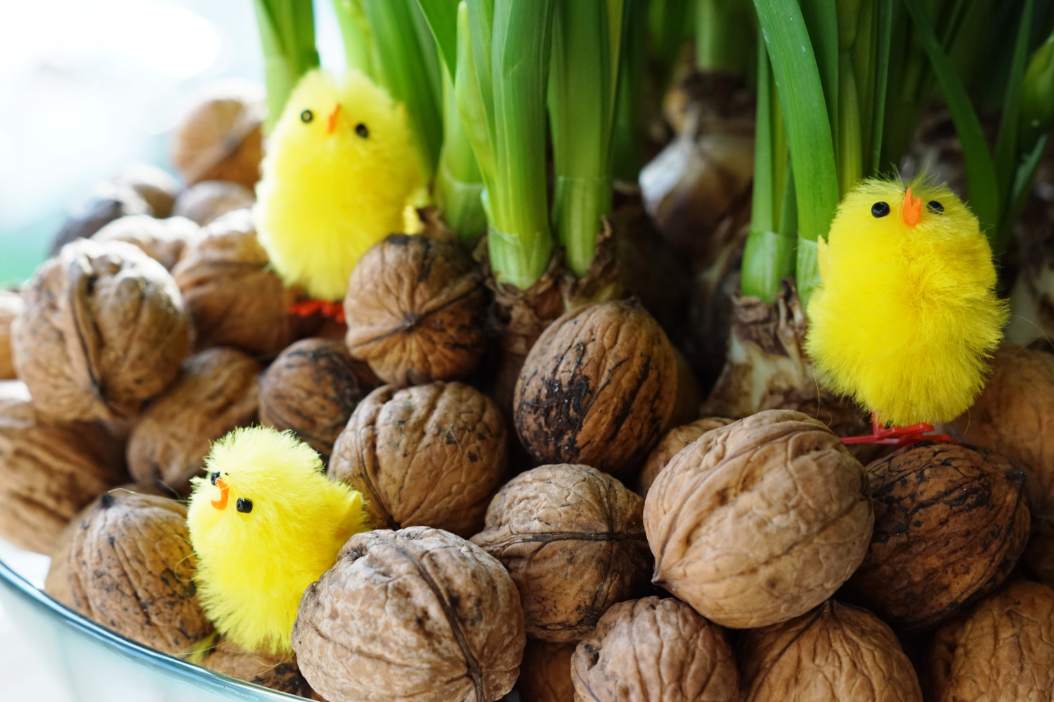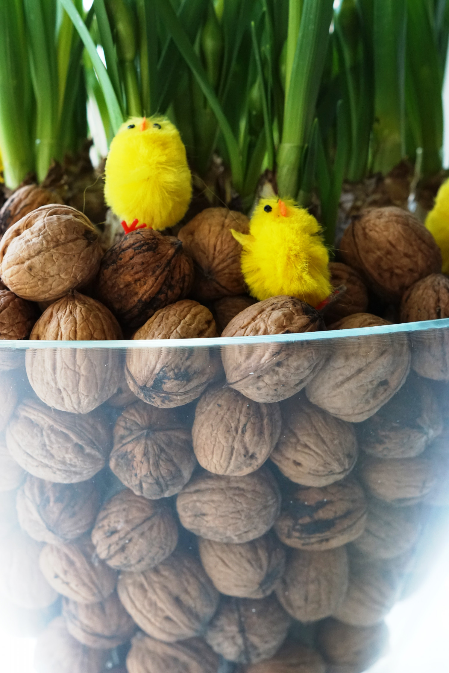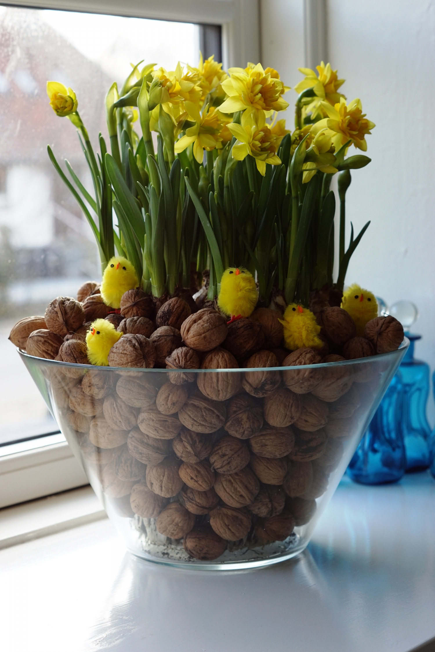 Da skålen var lidt for stor hældte jeg en masse af efterårets valnødder omkring planten for dels at holde på planten og dels at give et pænere udtryk uden kig til jorden omkring blomsterløgene. Det var en rigtig fin løsning – og i valnødderne kunne de små fine kyllinger så flytte ind. Dem hjalp Isak på plads.