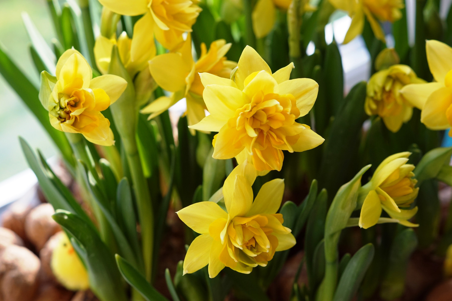 Når man køber påskeliljer på denne måde får man en langt bedre holdbarhed end med de afskårne af slagsen og mange flere muligheder for at sætte de gule liljer op i centrum af andre elementer som her.