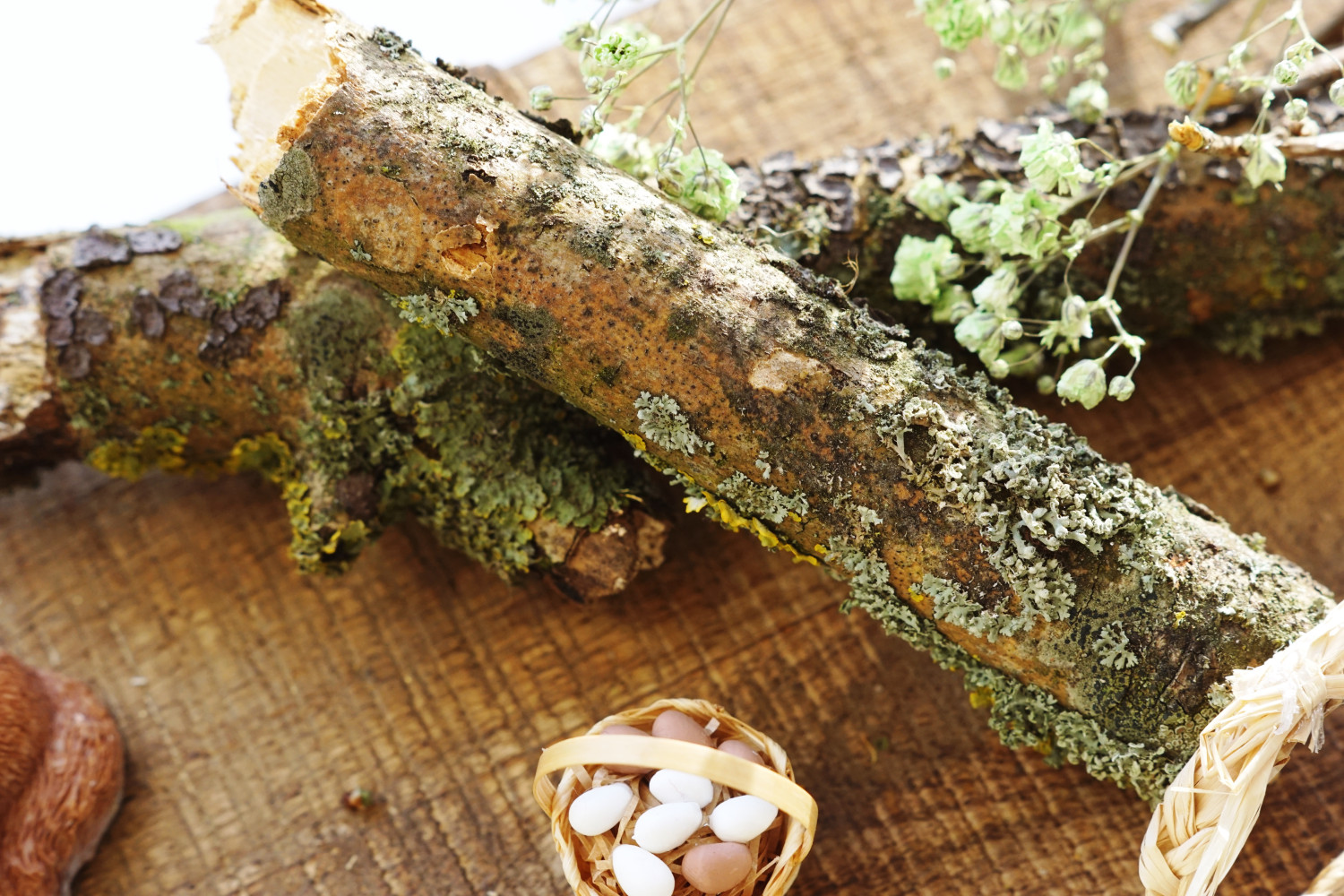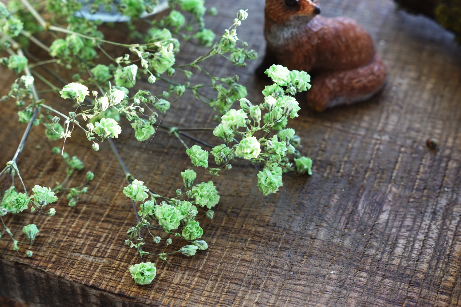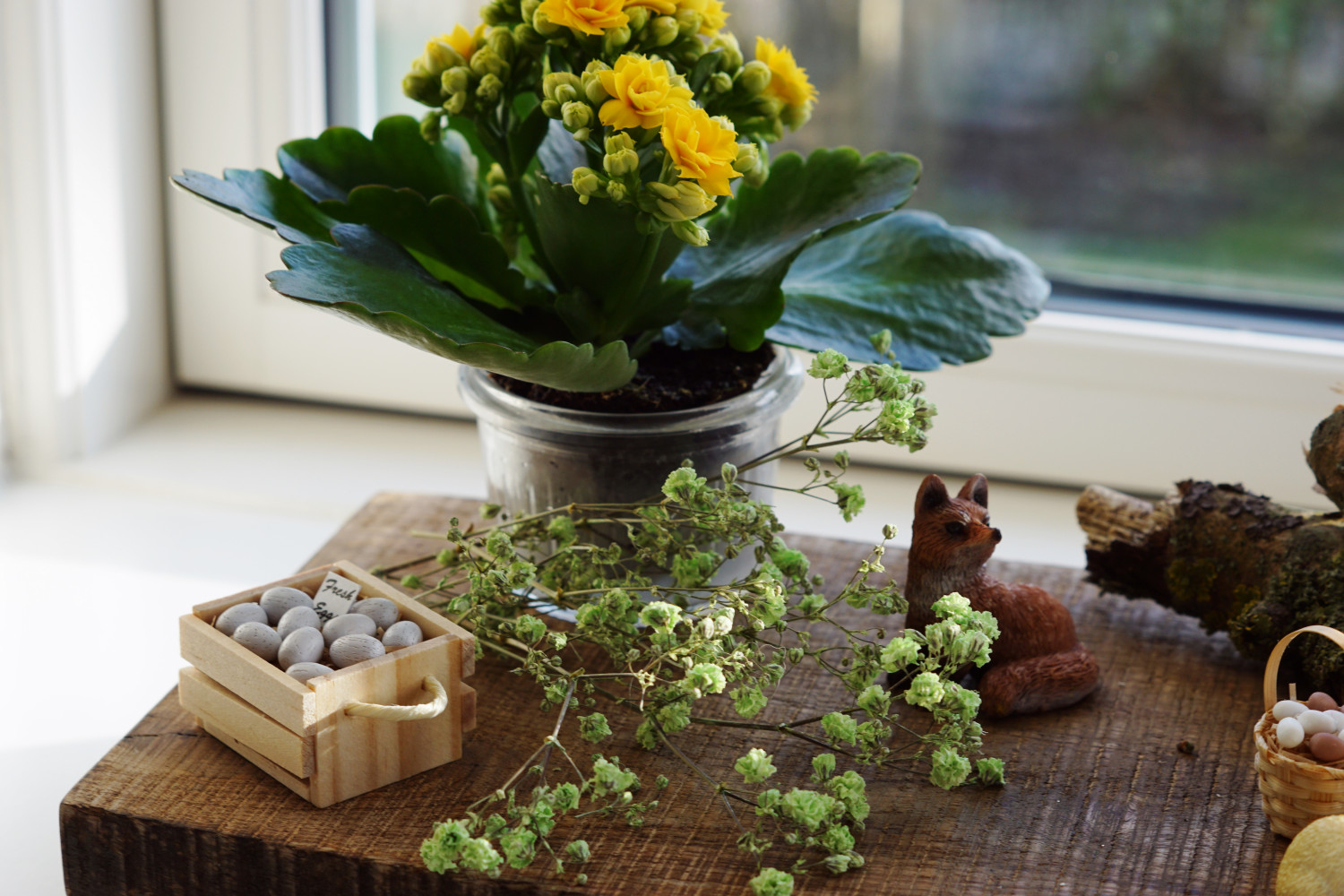 Man kan lade sig inspirere af alt muligt til sådan en lille “udstilling” som her. En lille gul blomst, der kan stå længe trækker ens tanker hen på den gule påskefarve og de tørrede (grønt indfarvede) brudeslør bidrager med yderligere forårsstemning. Grenene med det fine tørre mos på har Isak fundet i skoven. Det er alle ting, der er langtidsholdbare elementer og derfor kan den stå helt til påske.