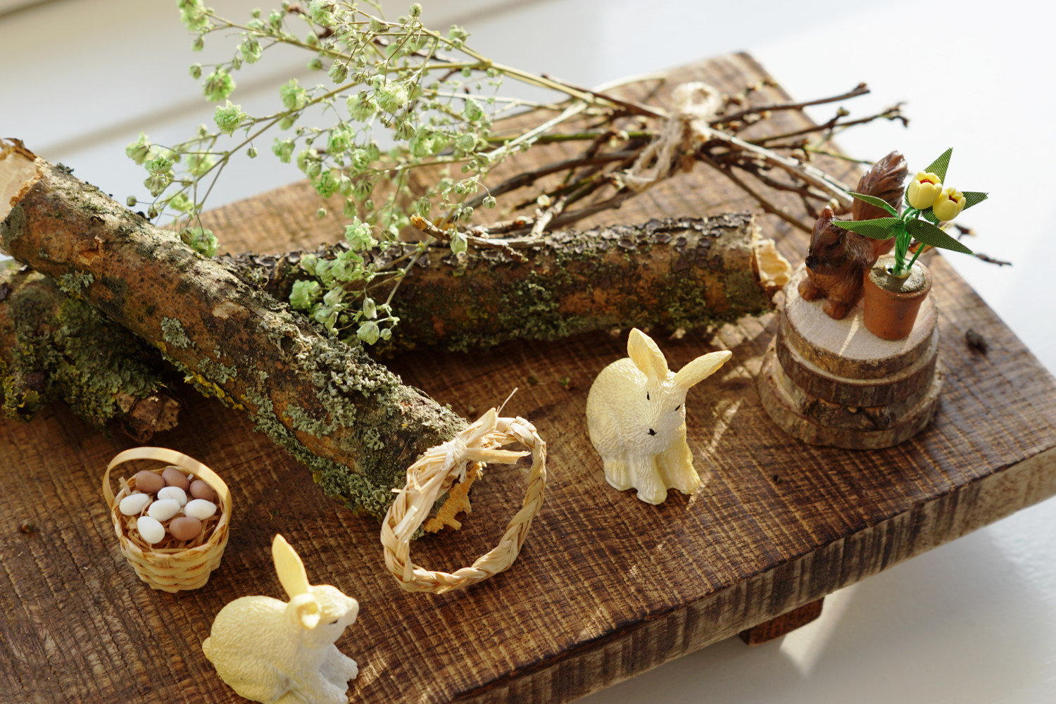 De små søde figurer fortæller en historie om skovens dyr og påskeharen, der samler æg. På den måde kan denne dekoration fortælle sin helt egen historie, som man finder på sammen med sit barn – og dét er jeg vild med.