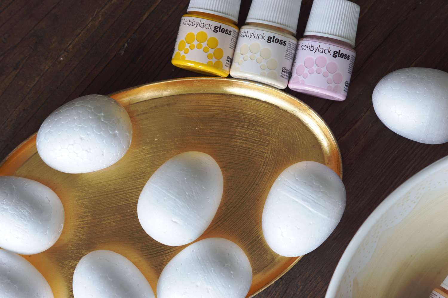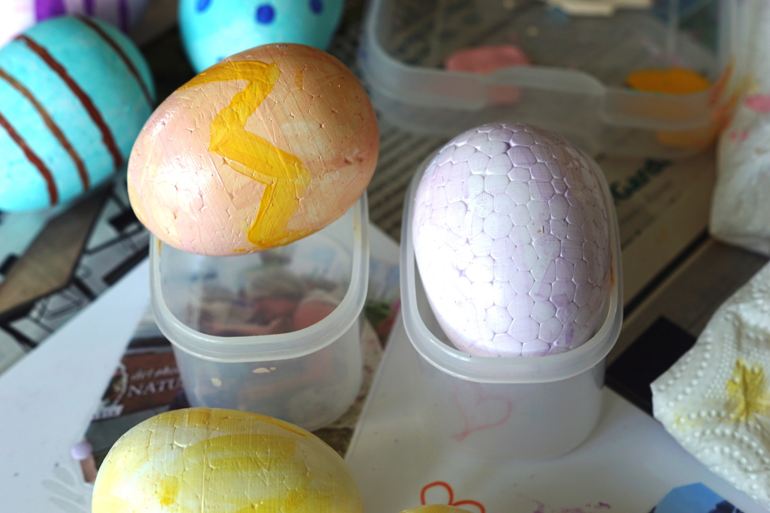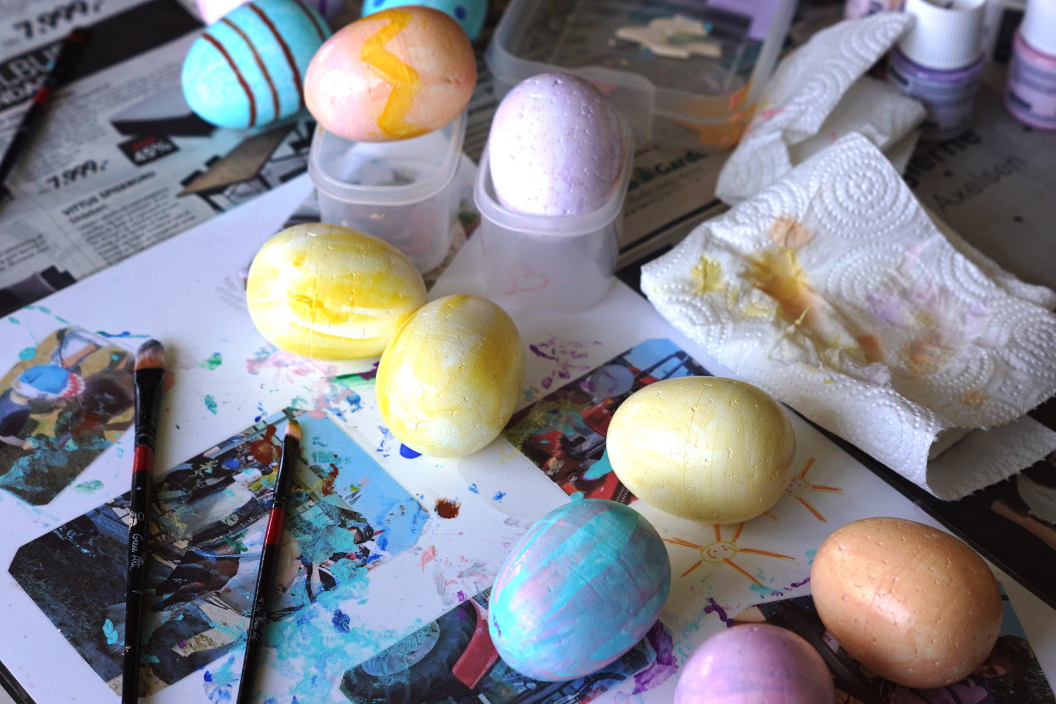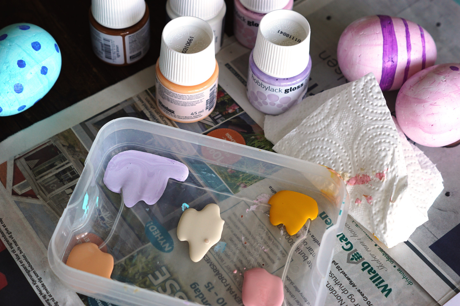 – Gammel tupperware til ophældning af maling og til at lade æggene hvile på imens de tørre (du kan helt sikkert købe fancy udstyr i hobbyforretningerne, men det her er den billige løsning)