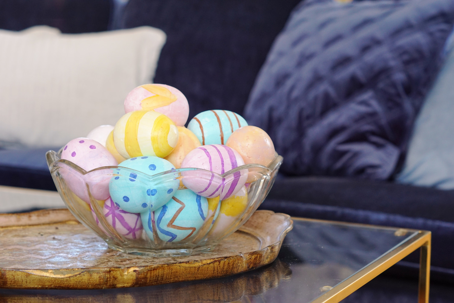 Stil de smukke, farverige påskeæg frem i en dekorativ skål i hjemmet.