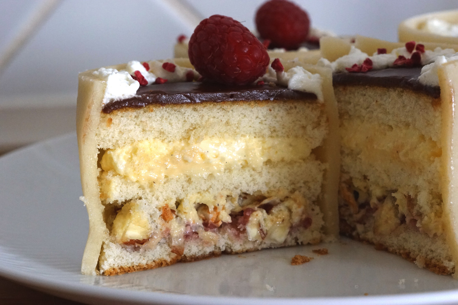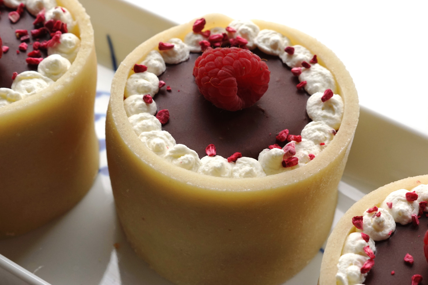 Pynt langs kanten med flødeskum og dekorer med frysetørret bær og frisk frugt efter smag.