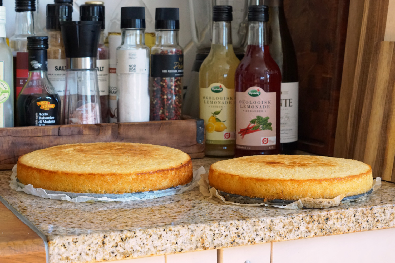 Jeg har her bagt to citronmåner og lavet to forskellige nuancer af gul glasur – men kagen er den samme.