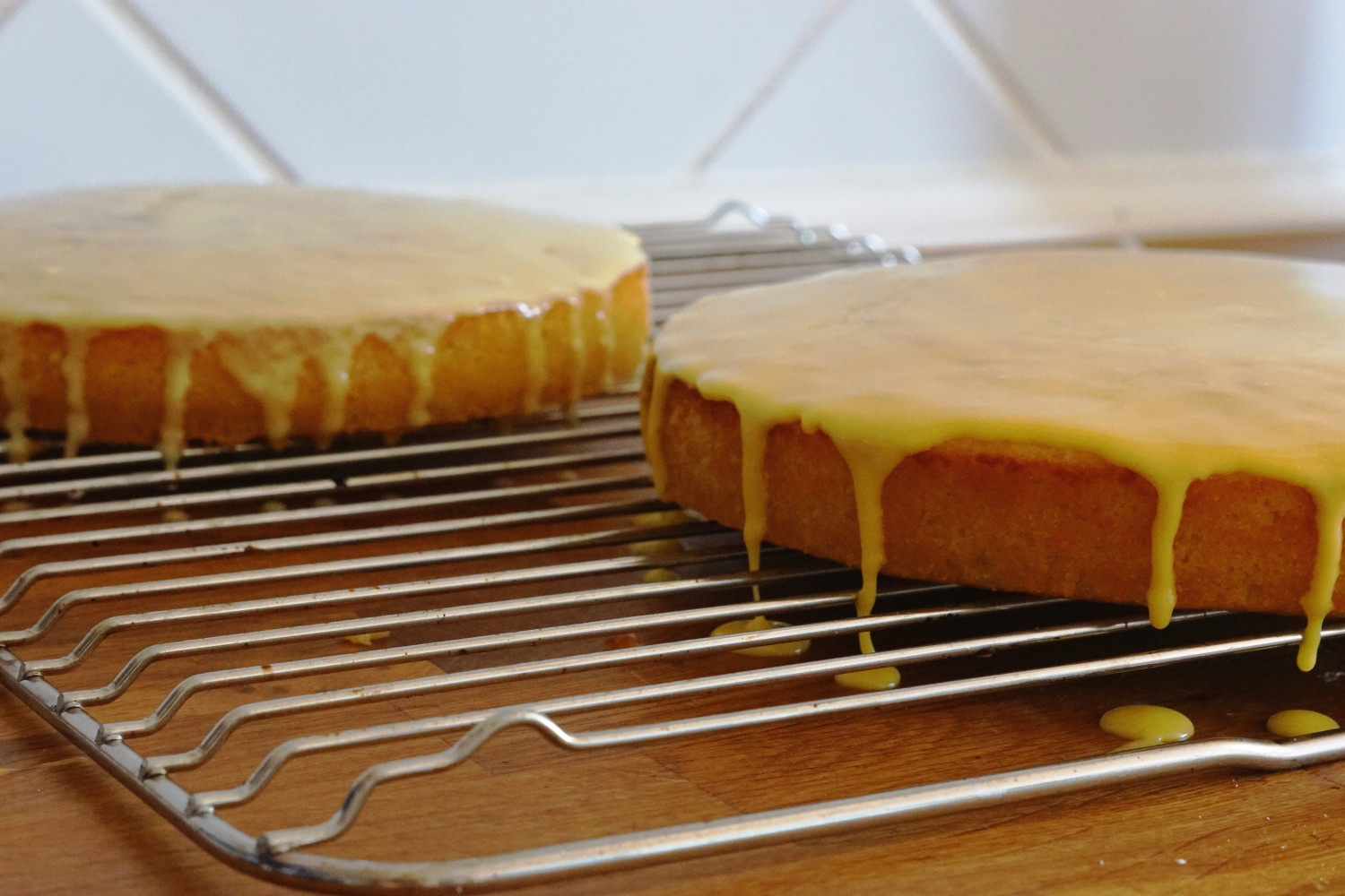 Rør glasur af friskpresset citronsaft og flormelis. Farv glasuren i en gul nuance med gelefarve. Du skal bruge ca. en deciliter færdig glasur som du dækker kagen med. Lad gerne glasuren dryppe ned over kagens kanter.