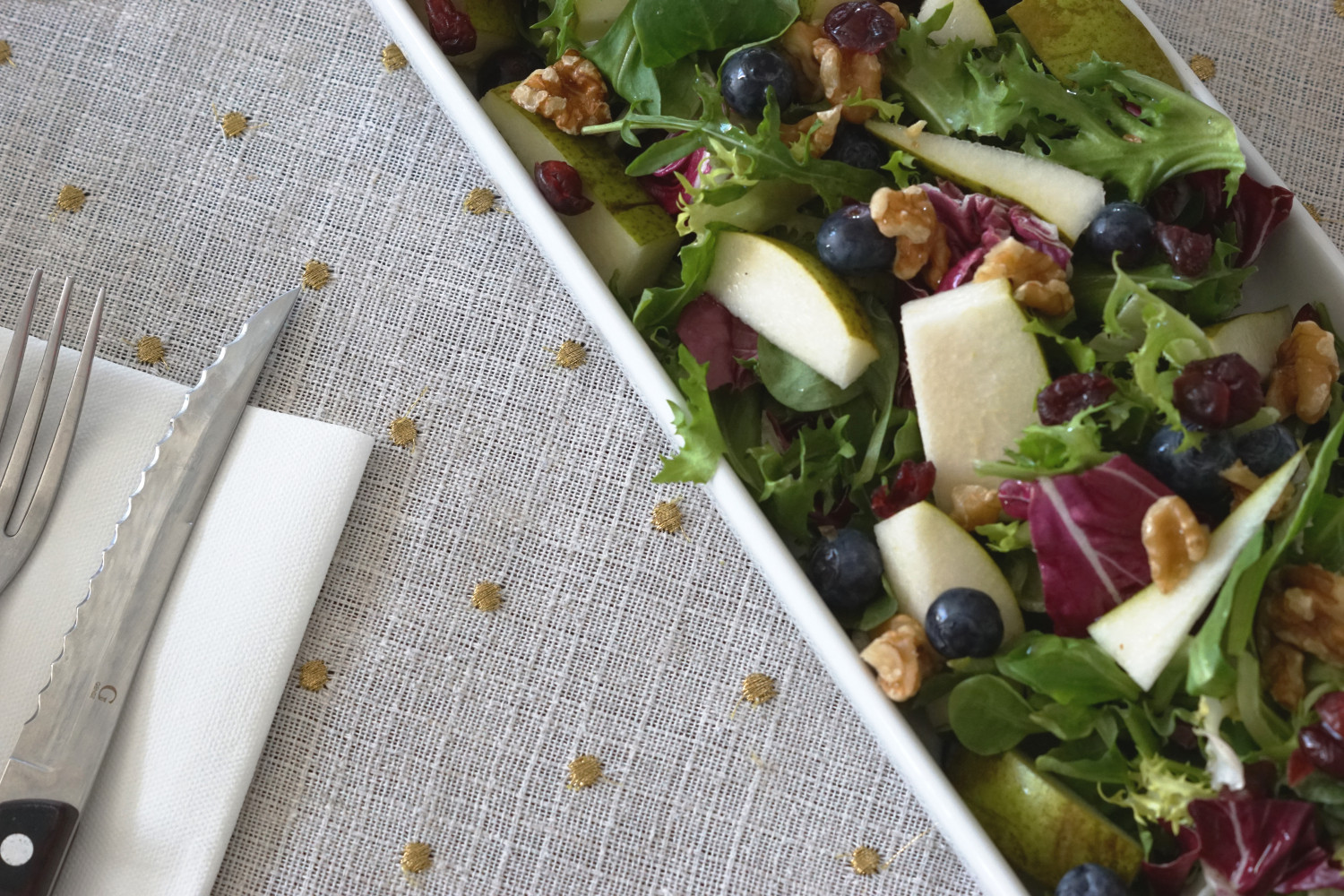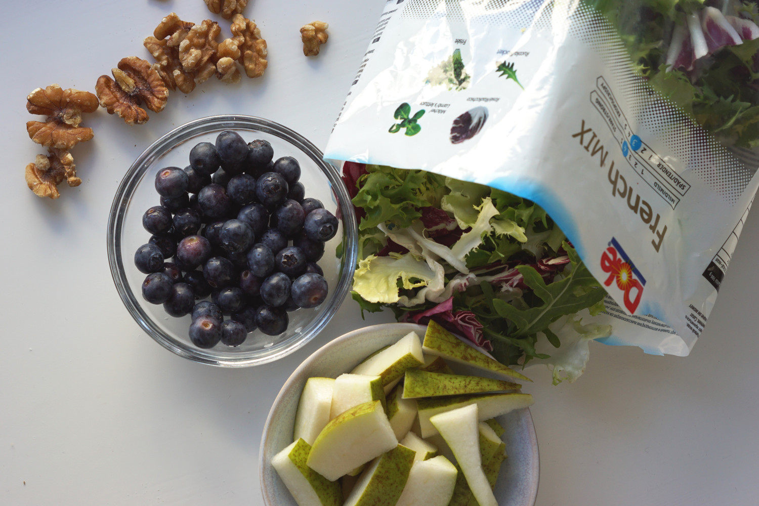 Anret den skyllede salat på et fad. Skyl pæren og skær den i grove stykker. Skyl blåbær. Arranger pære og blåbær over salaten og drys med tranebær og knuste valnødder.