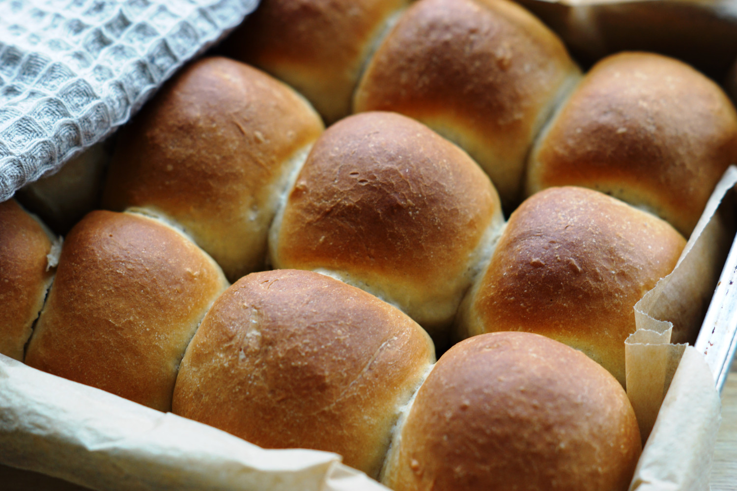 Rul hvert stykke til en bolle og placer dem på række i et firkantet ovnfast fad (størrelse af en halv bradepande – bager du dobbelt portion kan du bruge en dyb bradepande). Lad der være 1-2 cm mellem hver bolle og fyld fadet ud.