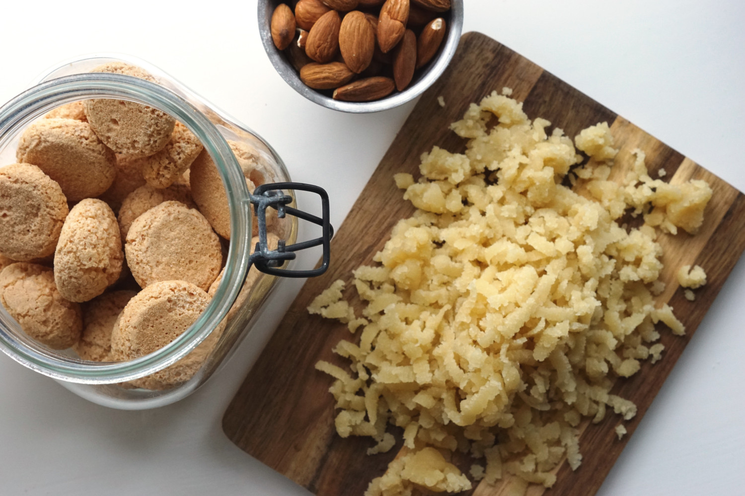 Vend melet skiftevis i dejen med mandler, makroner og marcipan.