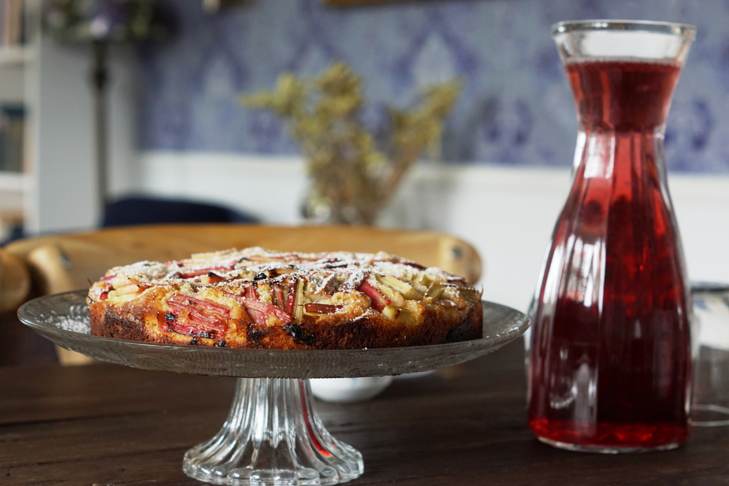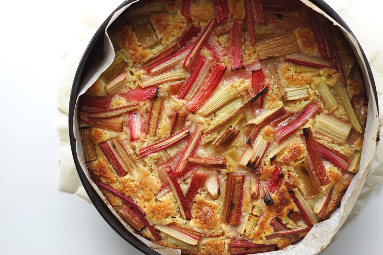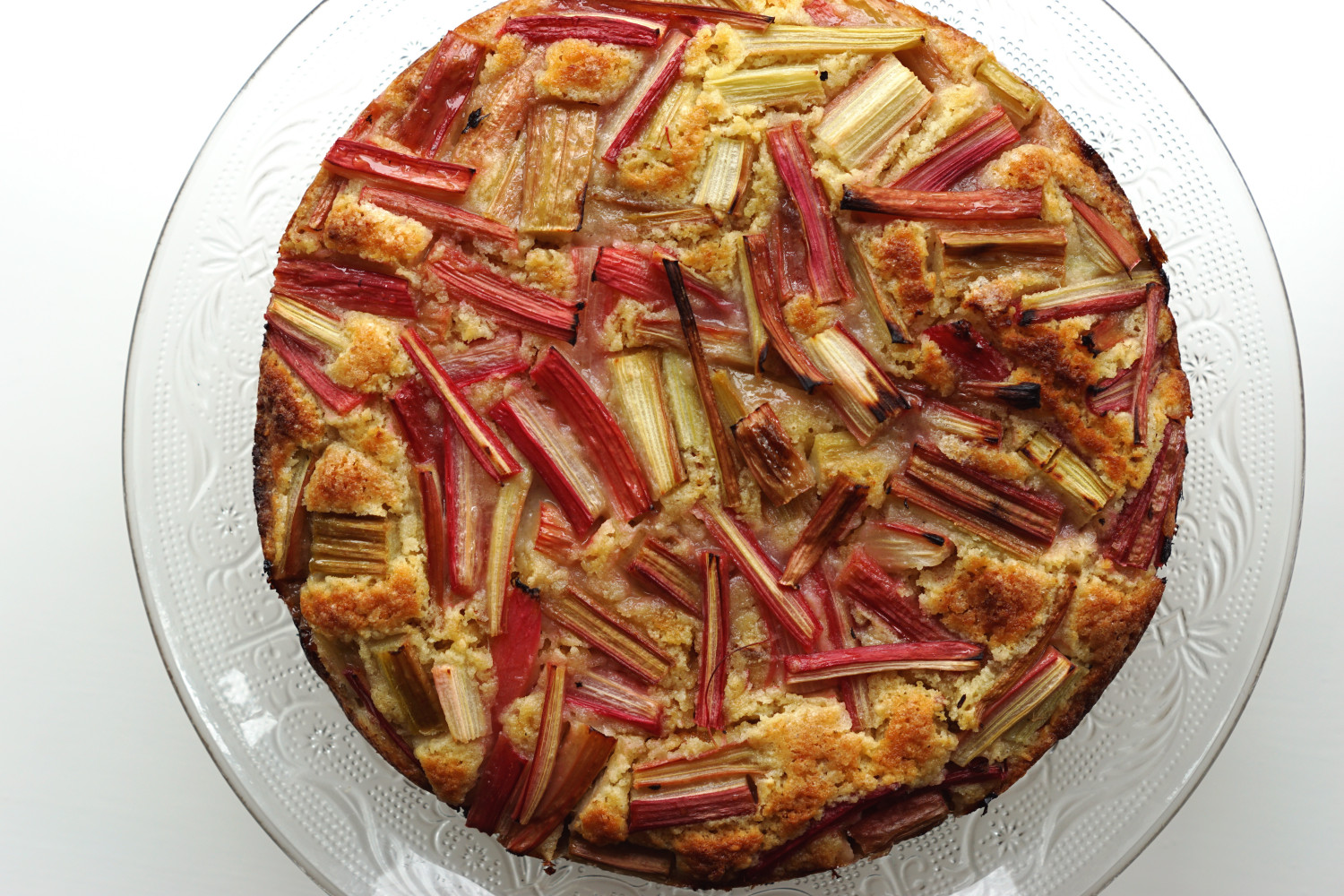 Fordel rabarberne jævnt over kagedejen og tryk dem forsigtigt en smule ned i dejen. Drys med 1 spsk sukker over kagen og bag den i ovnen ved 190 grader over-under varme i 40-45 minutter. Husk at ovne er forskellige, så kig jævnligt til kagen.