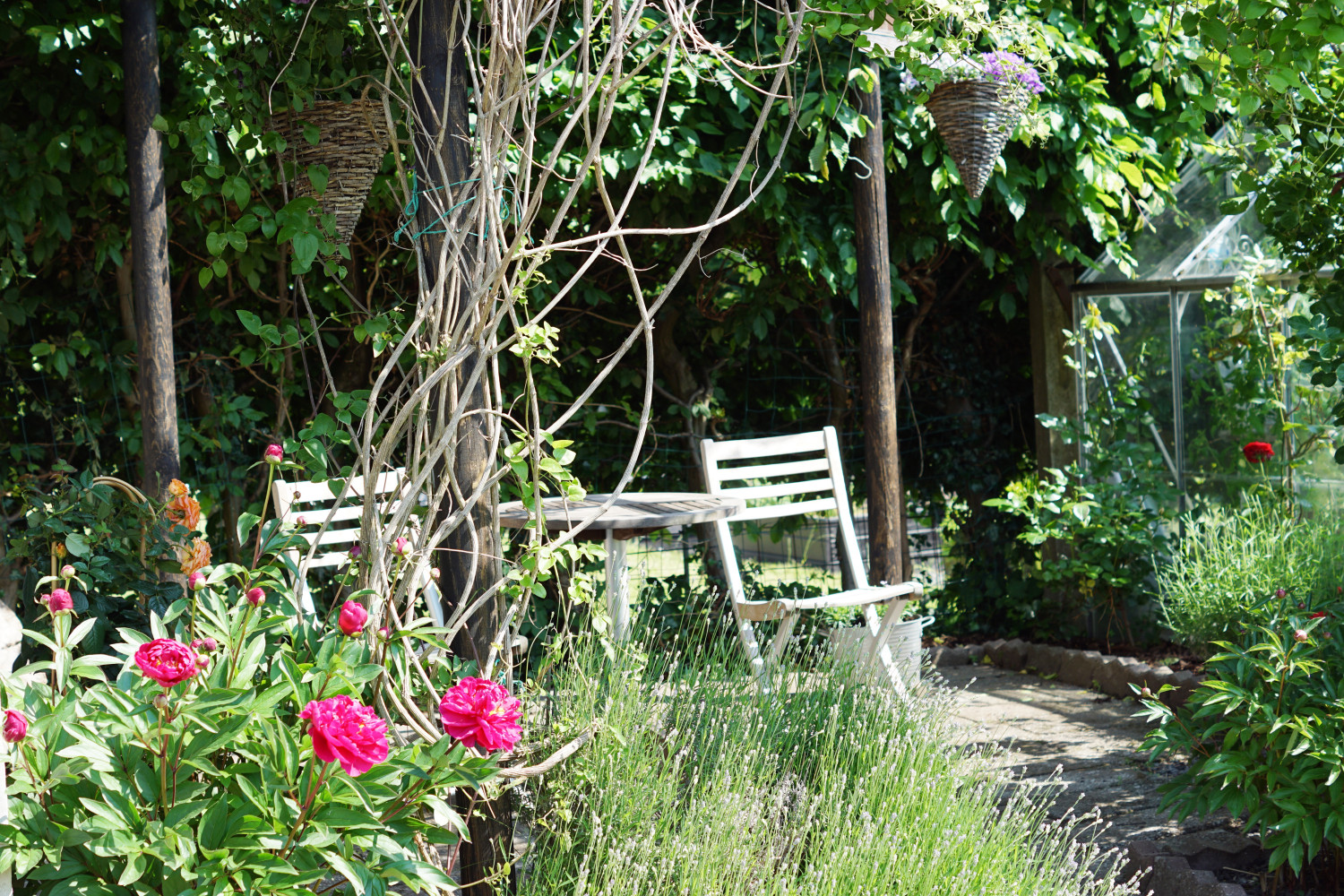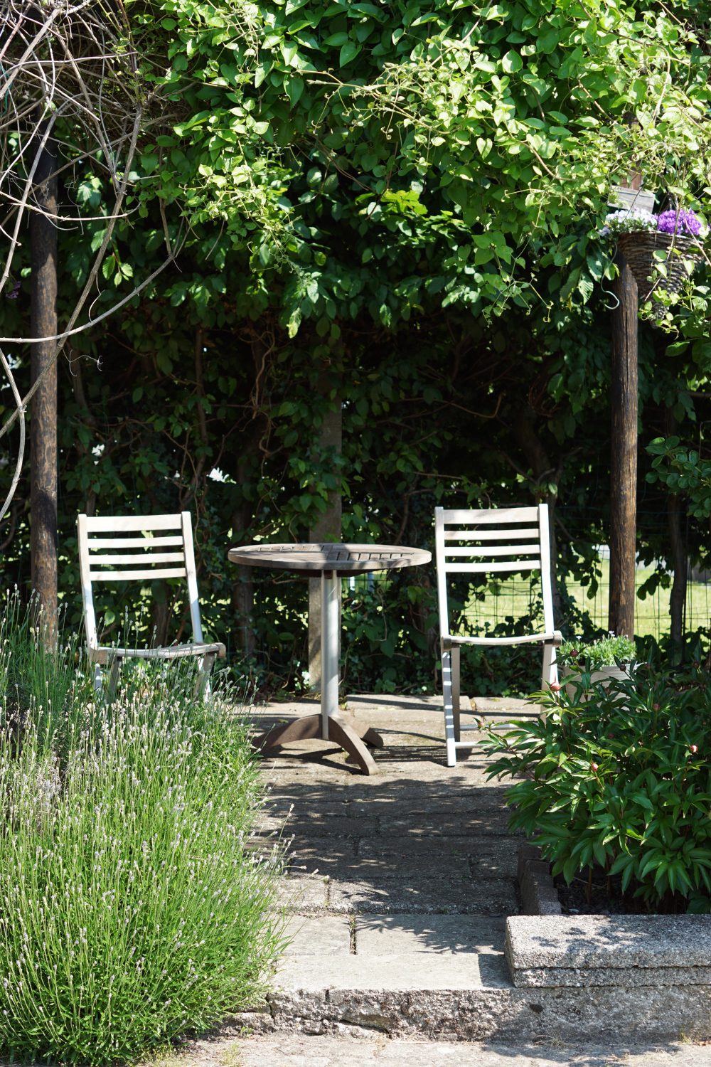 Her er der pæoner, lavendel og massevis af forskellige roser. Området har jeg indrettet med et bord-stolesæt, og så kan man sidde der og nyde en kop the eller kaffe. F.eks. imens Isak leger.