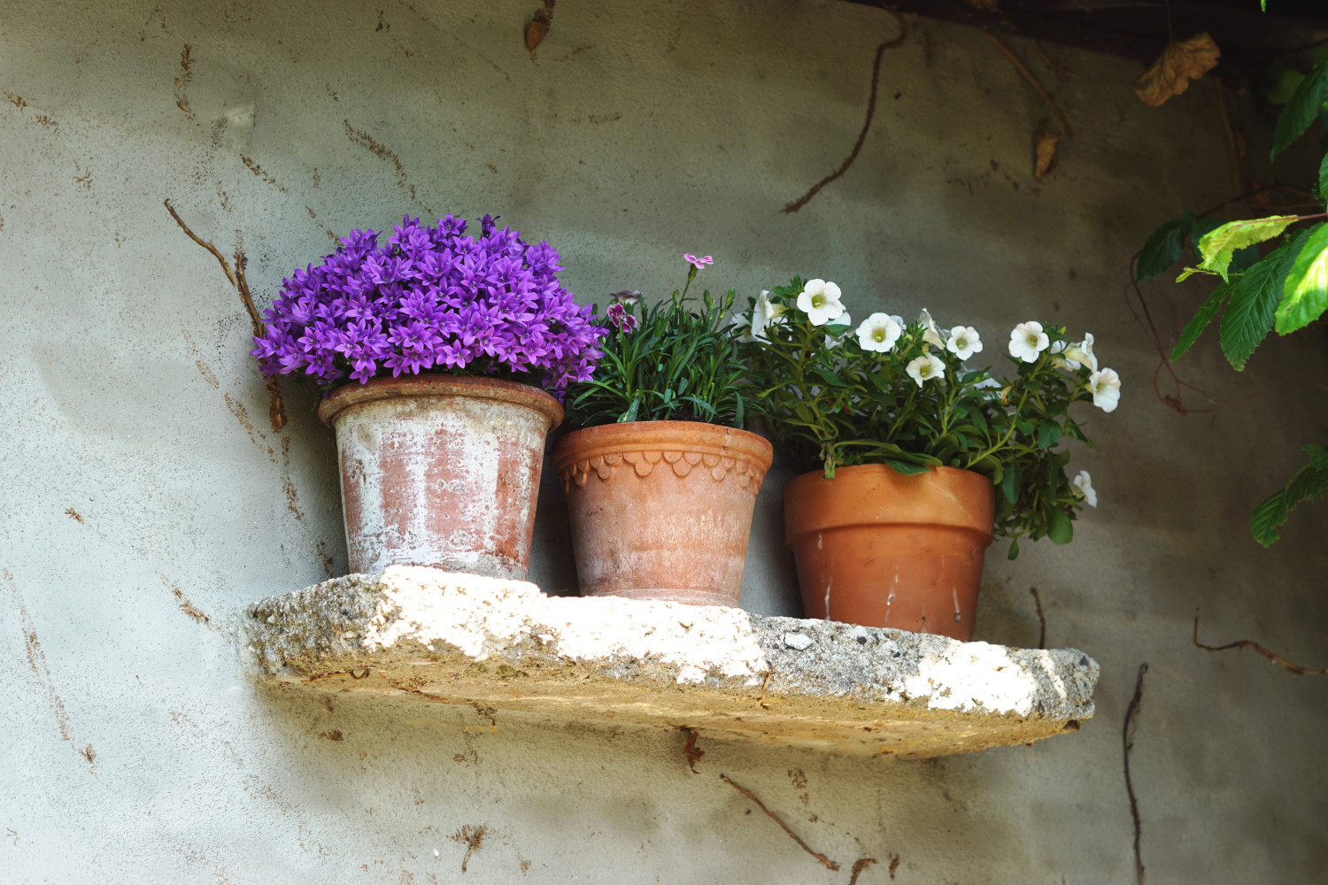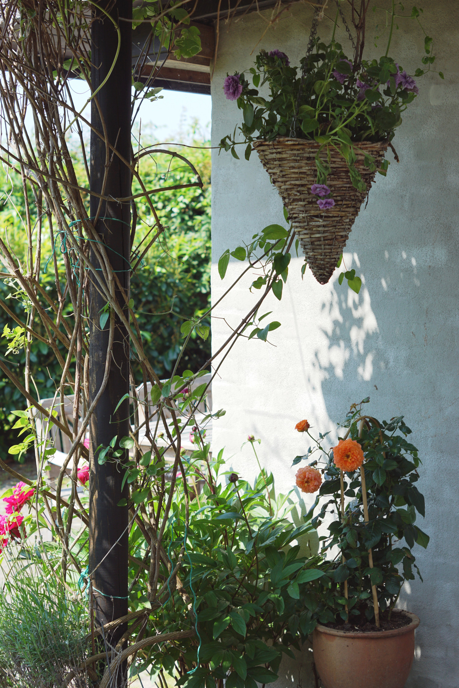 Jeg har selv i foråret sat endnu flere roser her, og så er der også kommet lidt hængekrukker op med farverige blomster.