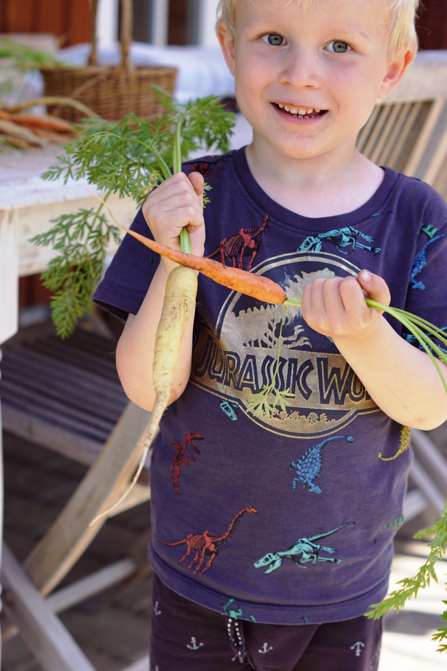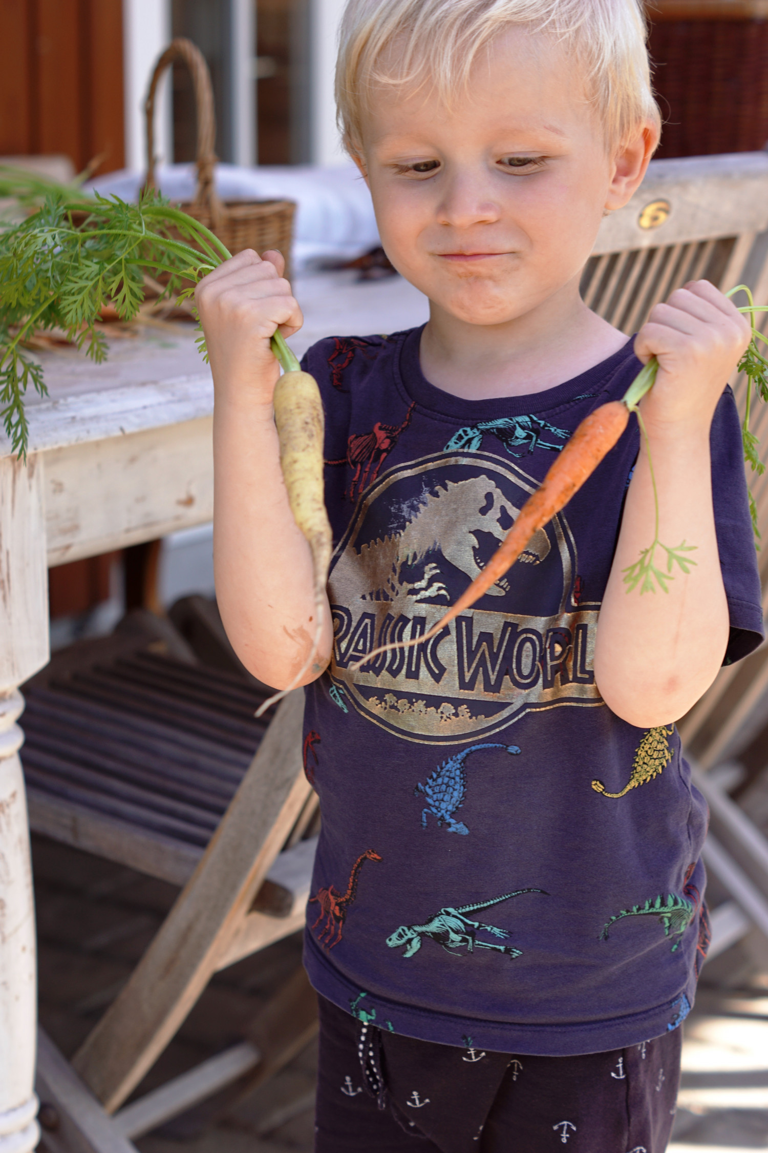 Isak er meget begejstret for gulerødderne og spiser dem med STOR vellyst. Grøntsager er ellers noget jeg nærmest har måtte luske i ham/overtale ham til de seneste par år. Da han var baby røg kogte gulerødder, ærter, dampede broccoli og diverse grøntsagsmos nemt ned, men det er som om, at ved han har opdaget, hvor lækkert brød, sovs og kød smager, ja, så er de grøntsager bare ikke super interessante. Tænker ikke jeg er den eneste mor med den udfordring.
