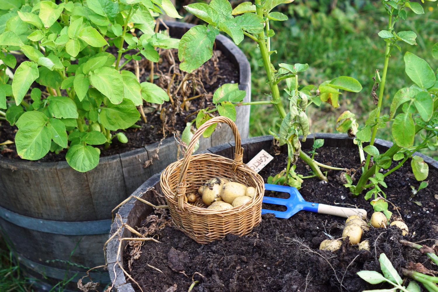 Kartoflerne her satte jeg for godt og vel 10 uger siden i nogle overskårne vintønder. Jeg synes hver plante giver et rigtigt fint udbytte, men jeg kan allerede se, at jeg til næste år gerne vil have endnu flere kartofler. Og så er de to vintønder ikke helt nok ..