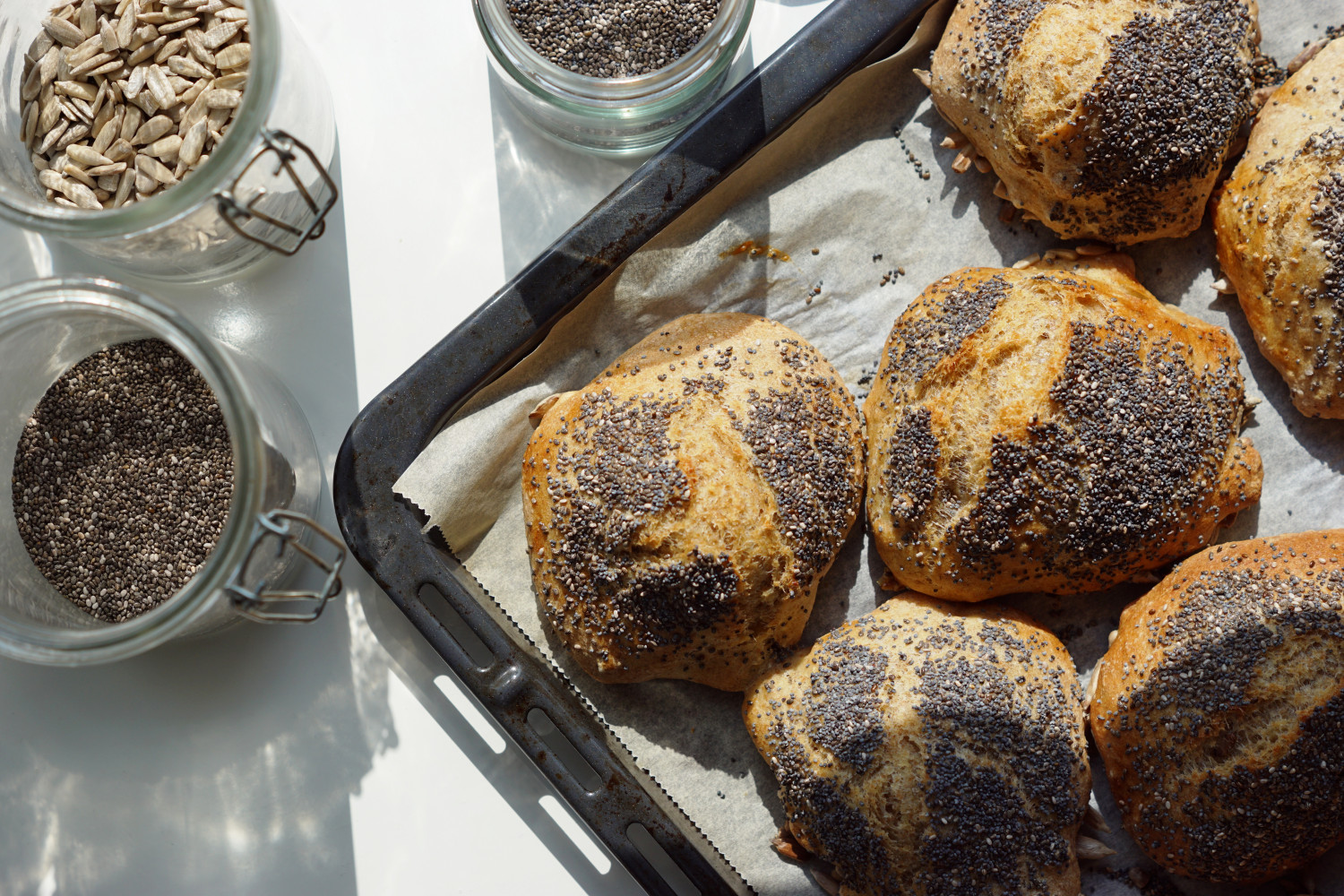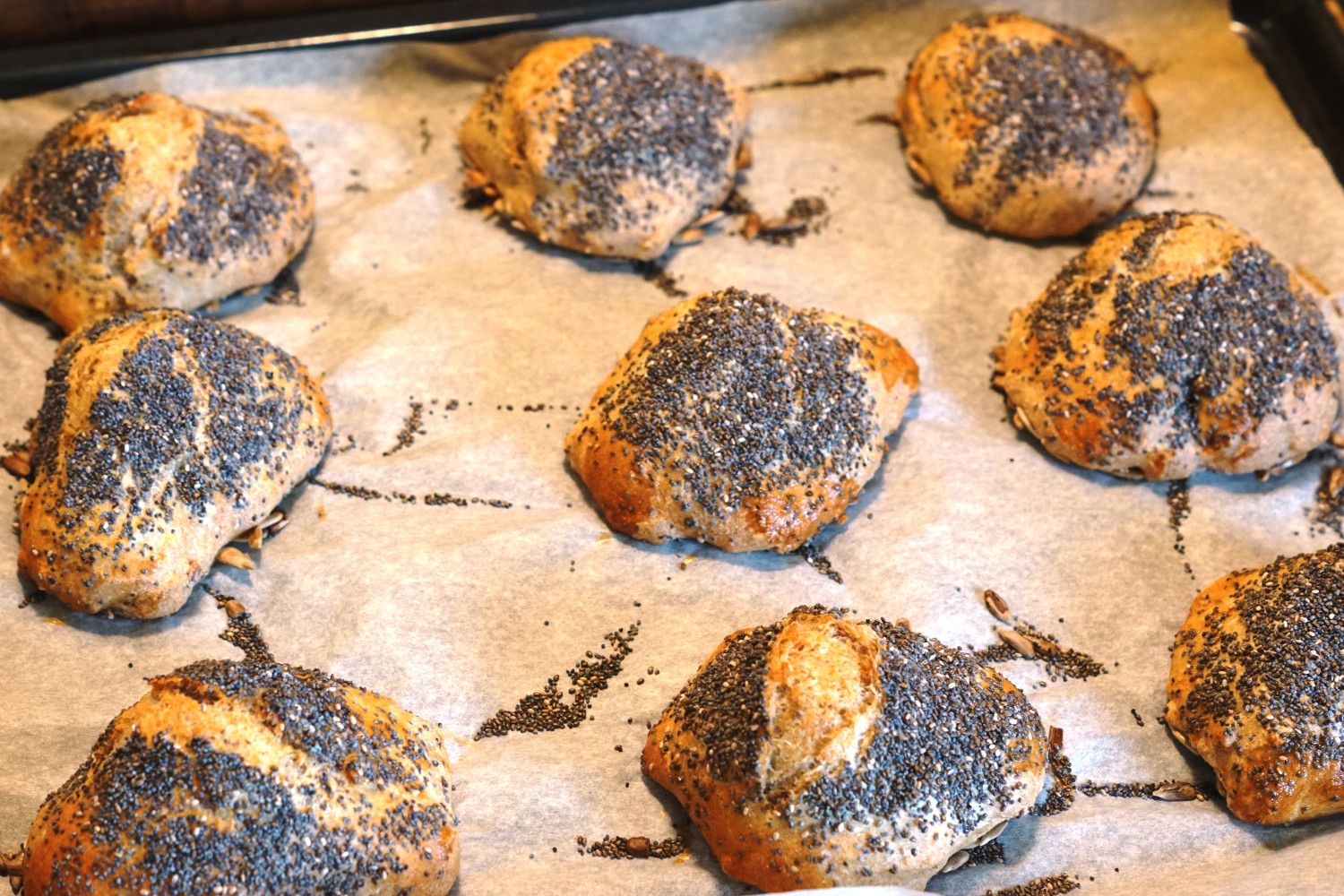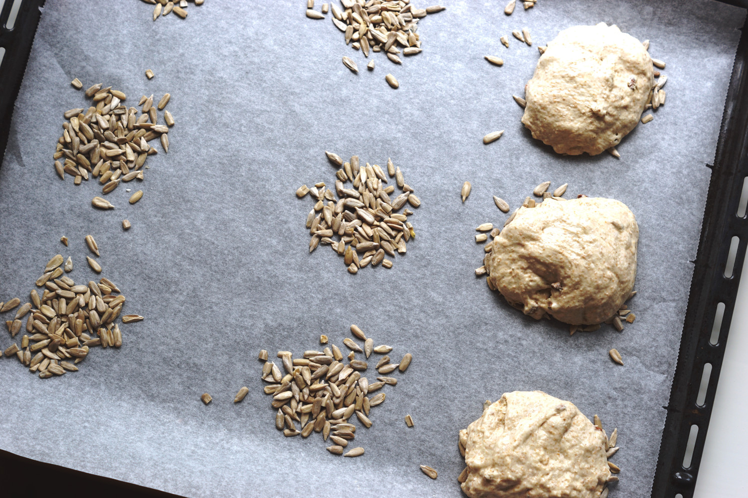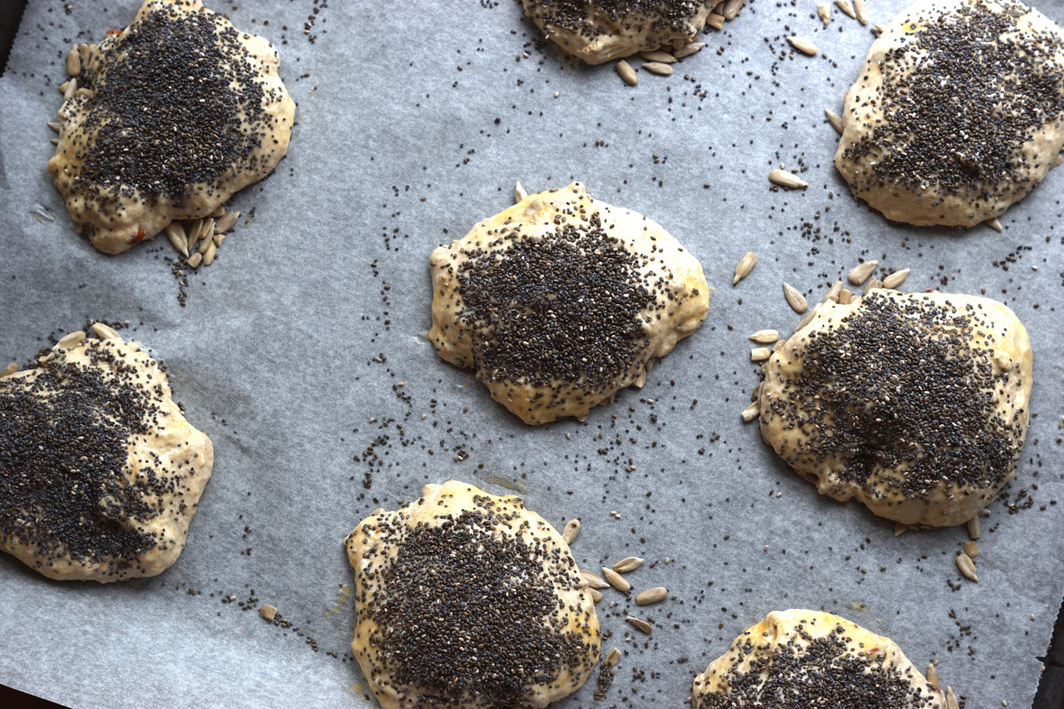 Beklæd en bageplade med bagepapir og drys små bunker af solsikkefrø ud. Placer klumper af dejen på dem med to spiseskeer. Pensl med æg og drys en blanding af birkes og chiafrø på toppen. Jeg får to plader af hver 9 stykker på hver. De skal IKKE efterhæve men direkte i ovnen.