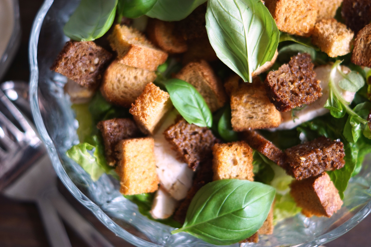 Her får du min opskrift – inkl. hjemmelavet cæsardressing og croutoner. Ja, faktisk er croutonerne den perfekte måde at få opbrugt lidt halvgamle brødrester på. Og de smager MEGET bedre end dem du køber!