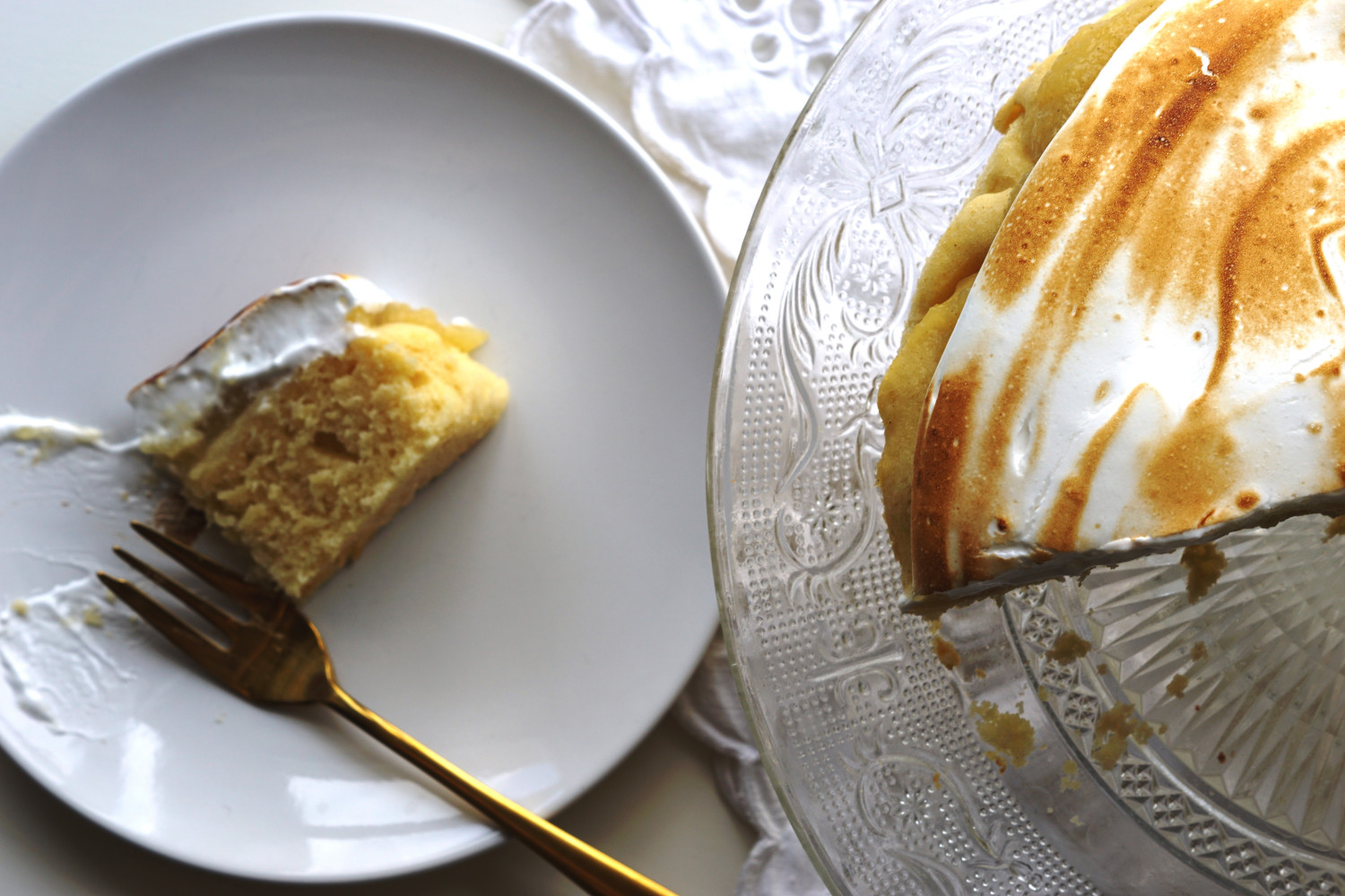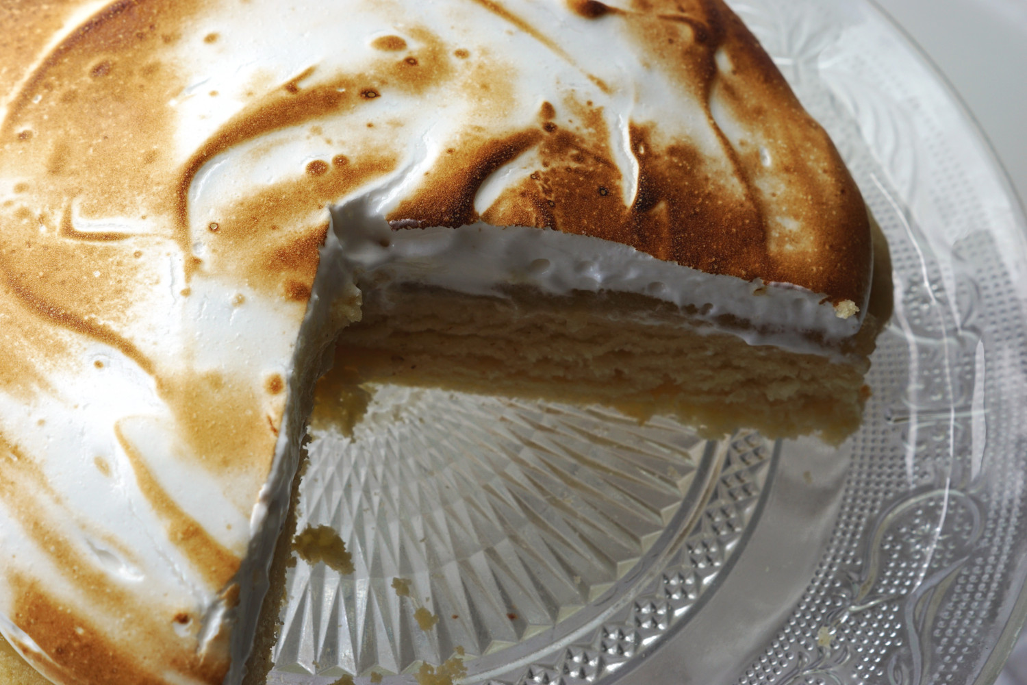 Tag kagen ud af ovnen og ud af sin form. Placer kagen på det fad, den skal serveres på. Fordel marengsen på toppen af æblemosen med en dejskraber. Brænd marengsen med en gasbrænder eller skru ovnen op på 225 grader varmluft og bag kagen i ovnen i yderligere 5 minutter til marengsen bliver gylden.