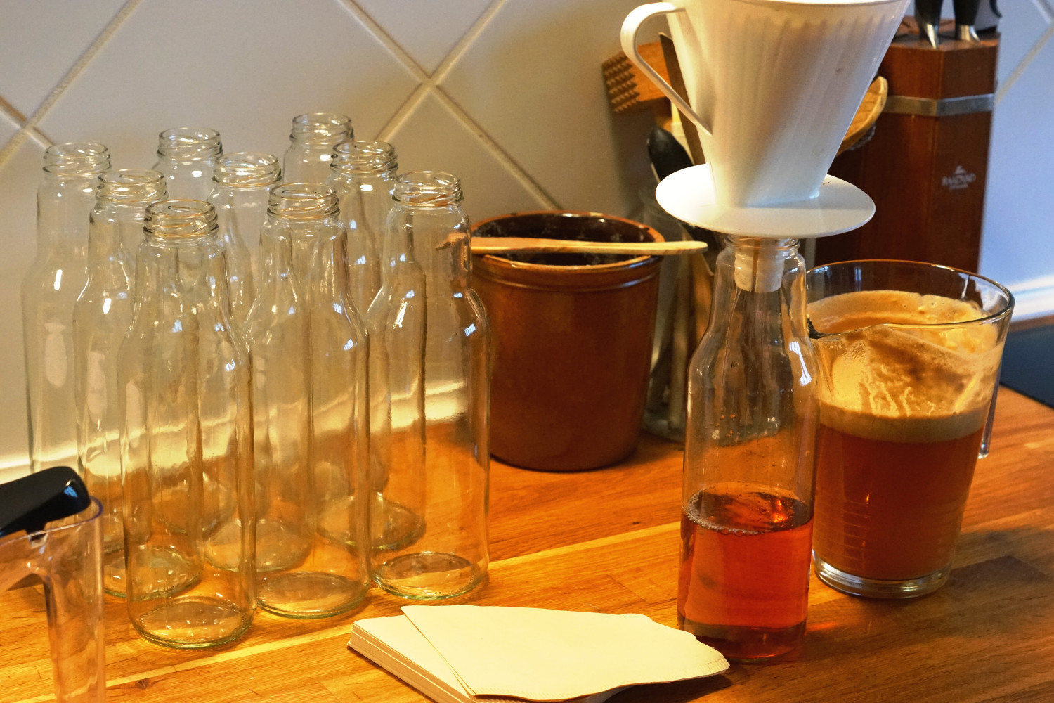 6. Herefter filtrerer jeg mosten ved at hælde mosten igennem en tragt med to kaffefiltre sat i. Tragten placeres ovenpå en helt ren kande til opsamling.