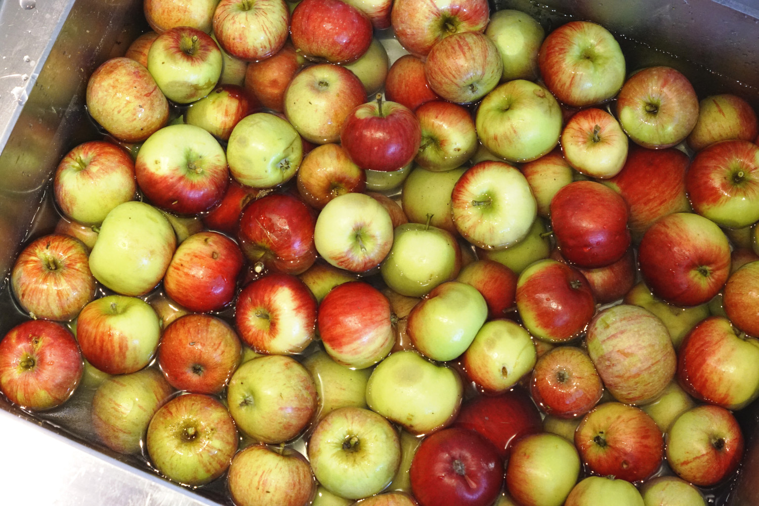 2. Jeg laver grovsorteringen af æblerne allerede ved indsamling. De æbler der helt sikkert ikke ser gode ud, de ryger i komposten udenfor. Når jeg kommer ind hælder jeg æblerne i håndvasken og fylder den op med 10 cm koldt vand. Jeg vender æblerne rundt i vandet, så de bliver skyllet for små insekter.
