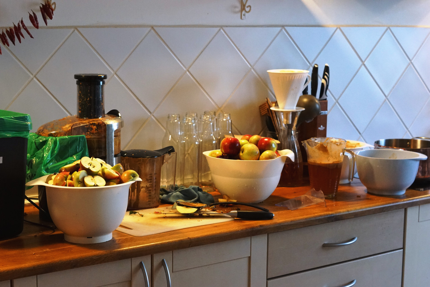 Den æblemost jeg laver er helt klar, fordi den filtreres. Jeg synes den ser pænere ud sådan, men det har også den store fordel, at jeg tydeligt kan se, hvis indholdet i flaskerne gærer eller danner mug. Det er stort set umuligt, hvis mosten står med skum og pulprester, der gør den grynet. Og ja, det hedder med rette “æblemost”. Most presses og konserveres som den rene frugtsaft og er et rent naturprodukt, imens juice er lavet af koncentrat.