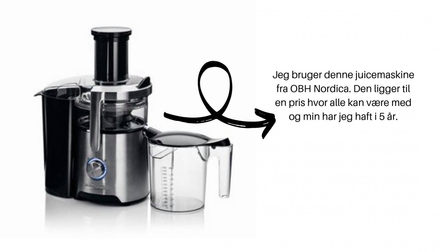 Den maskine jeg har er en solid maskine fra OBH Nordica. Den larmer en smule, men det er vel hvad man kan forvente, når den kan kværne hele æbler med skral, kernehus og stilk. Den kan tage alle frugter og grøntsager uden de skal skrælles først (dog ikke citrusfrugter – her må man lige fjerne skallen). Den har to forskellige hastigheder, en opsamlerfunktion og alle løsdelene kan gå i opvaskemaskine.