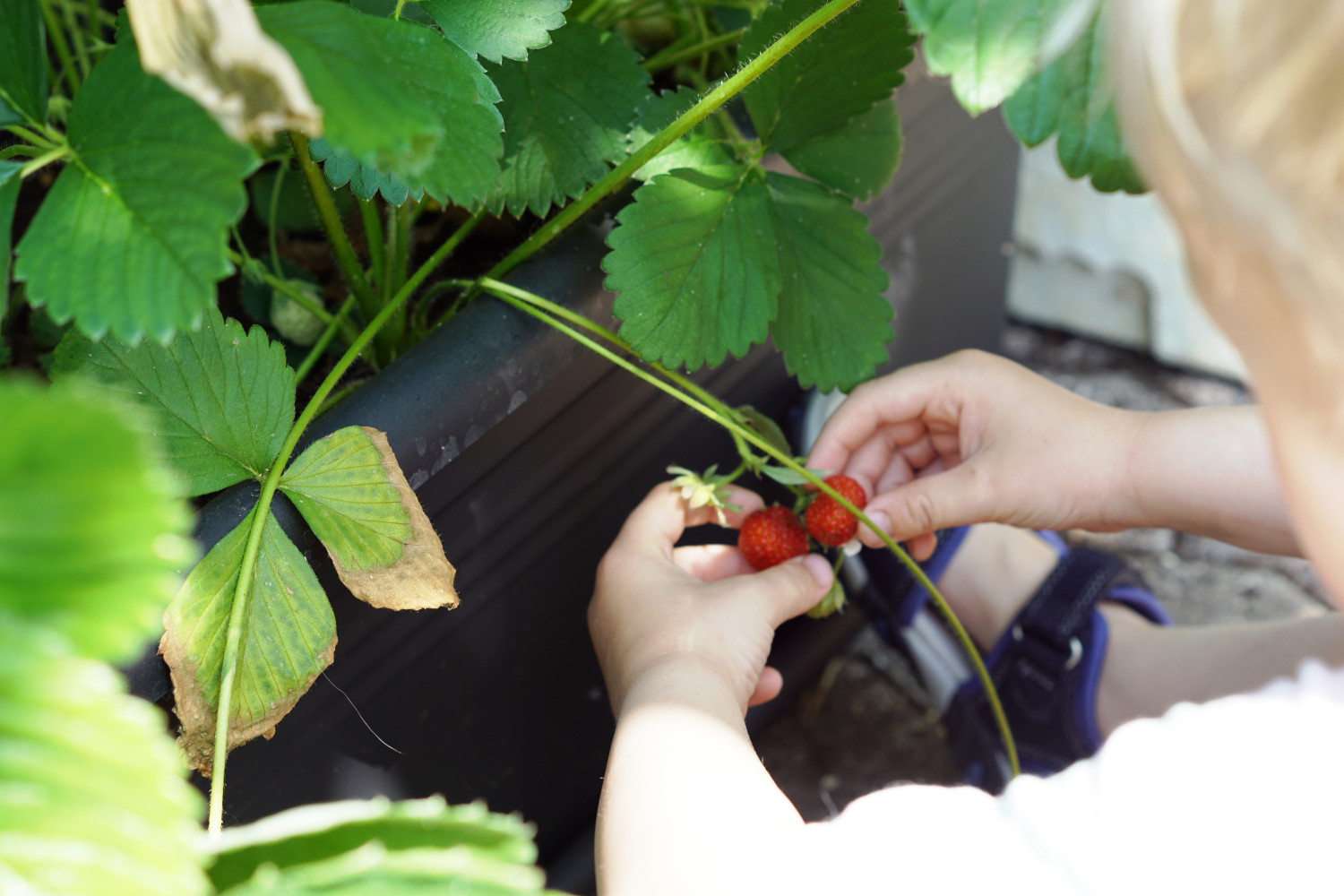 Jordbærplanter sender på denne årstid udløbere fra deres hovedplante. Udløberne er lange strenge hvorpå der dannes et nyt skud af jordbærplanten (såkaldte “stiklinger”). Og placerer du dette skud i jord, så slår det rødder. Efter en rum tid kan du klippe dem fra hovedplanten, og så har du en ny og frisk lille jordbærplante, der kan plantes ud til næste år.