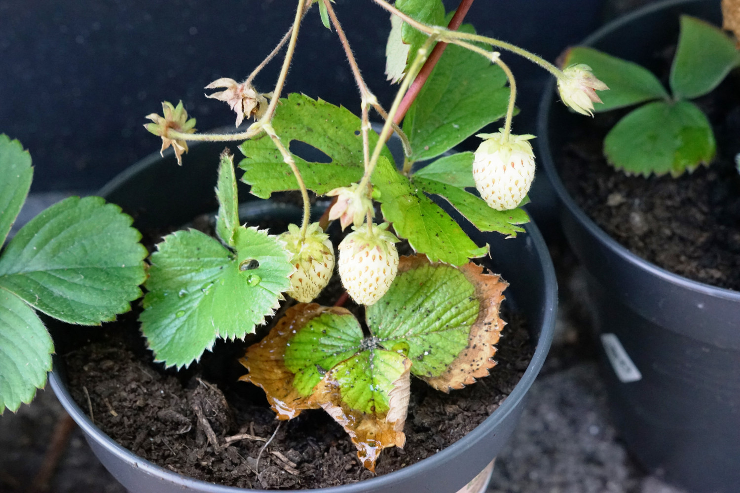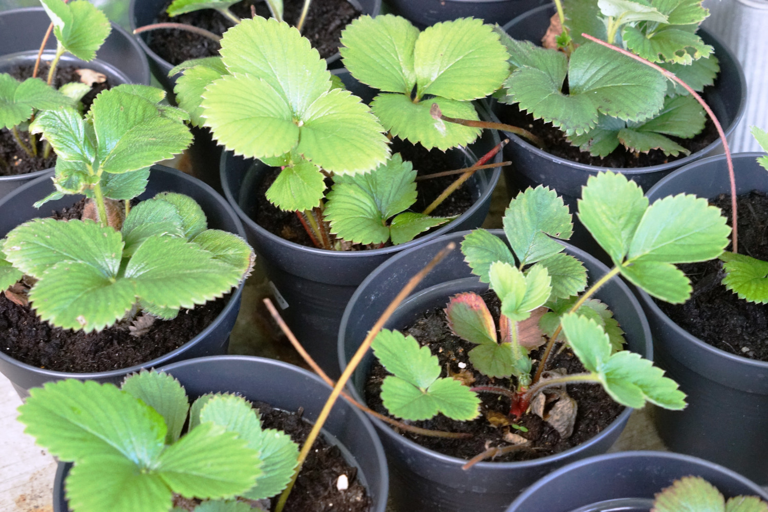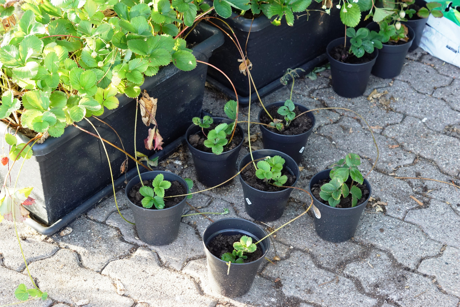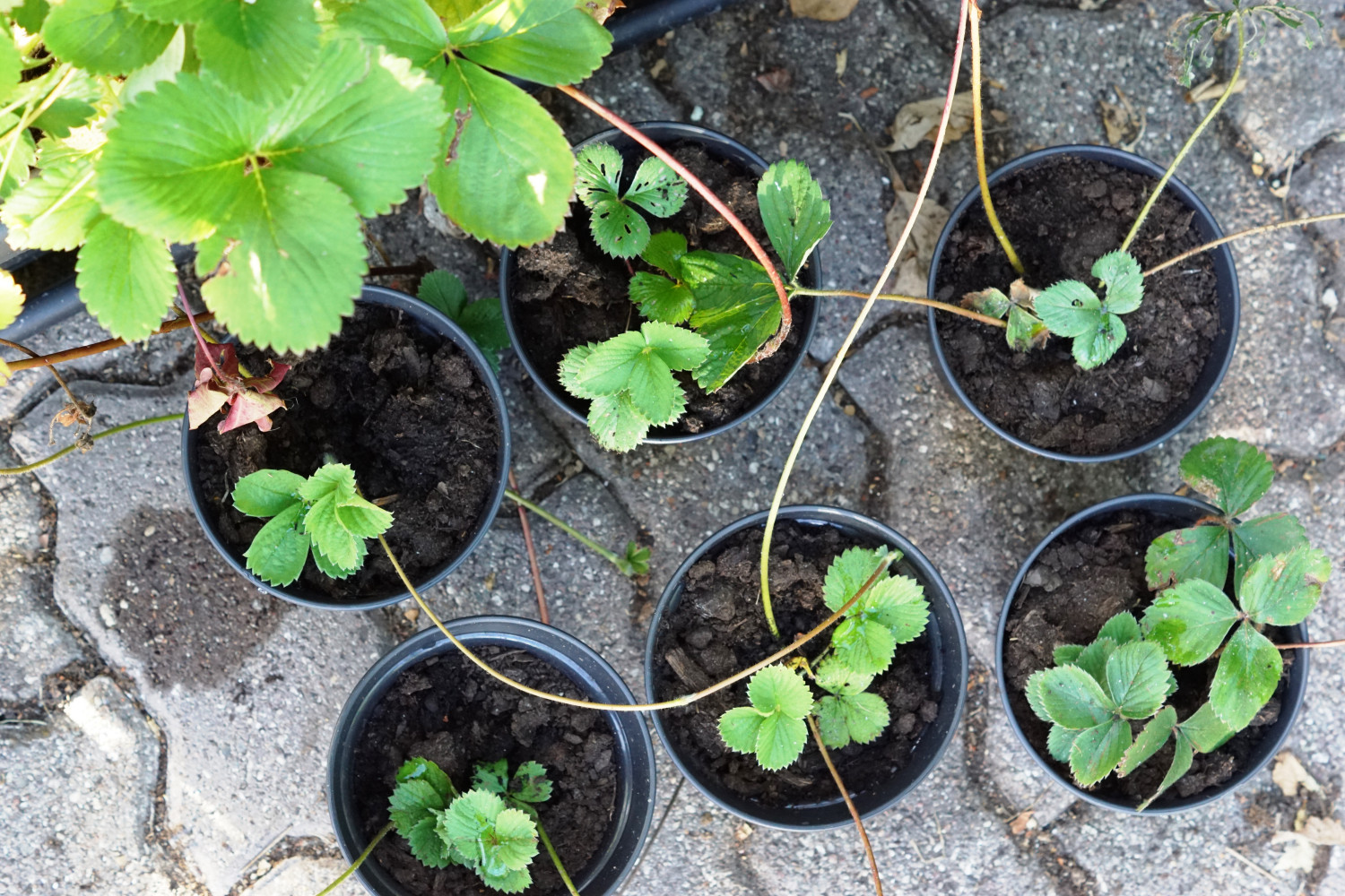 2) Potterne placeres langs jordbærplanterne med udløbere og de små stiklinger trykkes forsigtigt i jorden.