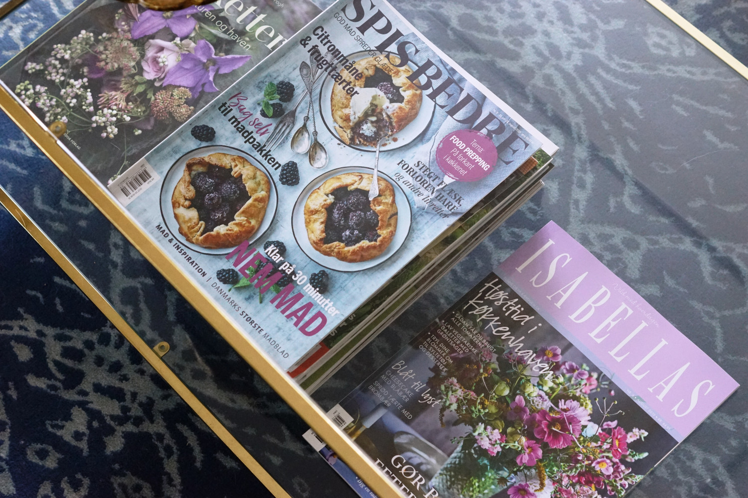 Sofaen og lænestolene i velour er gamle møbler fra et hotel i Sverige (mener jeg nok), som vi købte og fik ompolstret i den smukke midnatsblå nuance. Jeg ledte længe efter de helt rigtige pudebetræk til pyntepuderne, som ville matche møblernes betræk, tapetet i stuen og tæppet under sofabordet.
