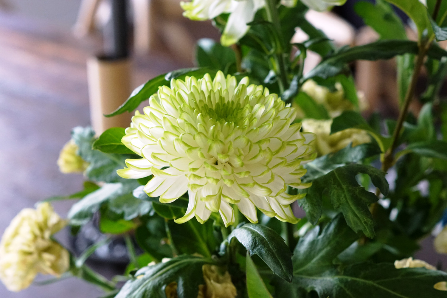 Her er denne buket perfekt – og ganske budgetvenlig! Den består af store krysantemum i hvid og strålende grøn og nelliker i en mere støvet grøn nuance. Som fyld i buketten har jeg brugt et par afklippede grene fra en busk i haven.