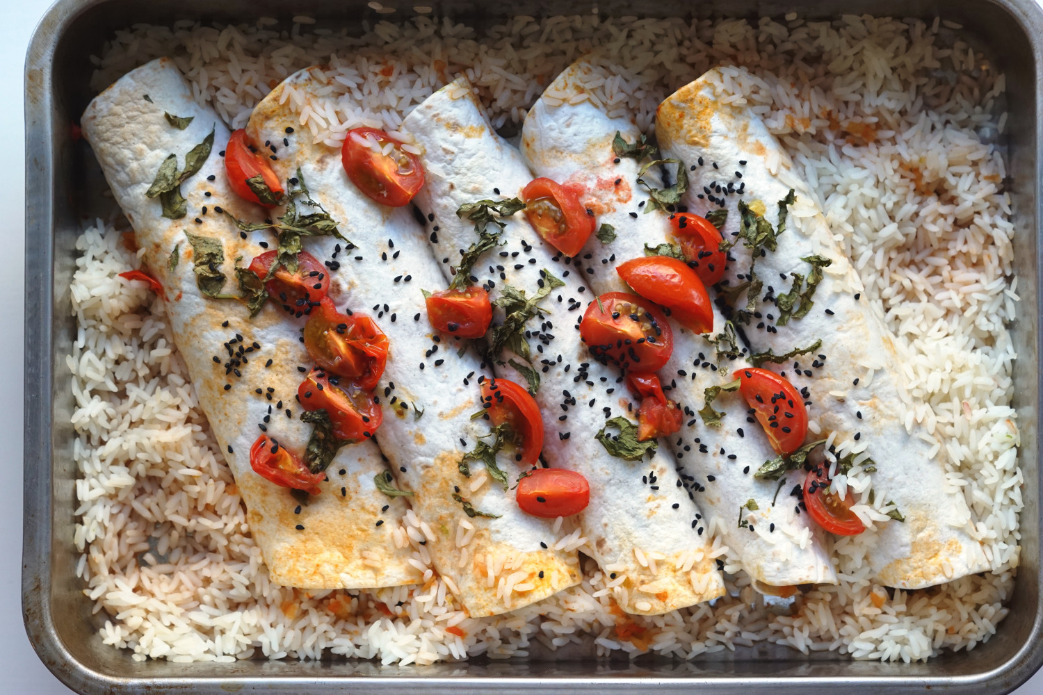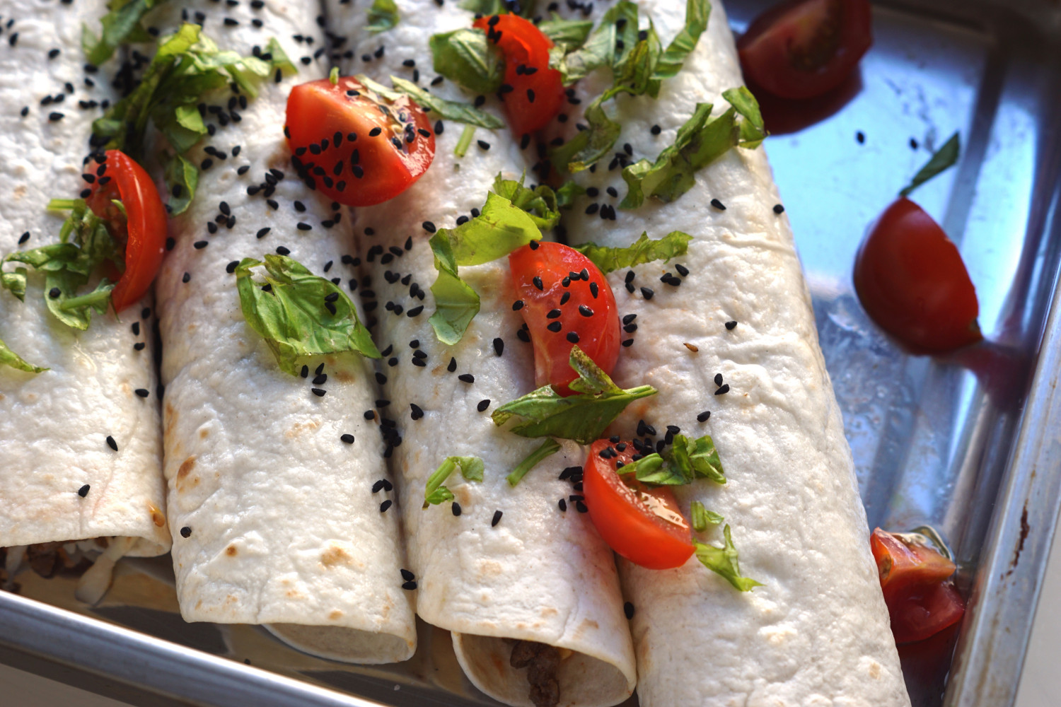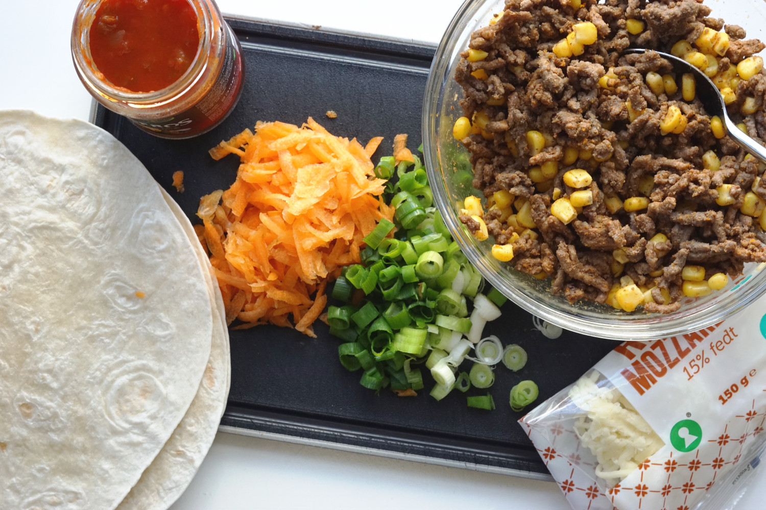 Fordel kødfyld, grønt, ost og 1 spsk salsa i hver af pandekagerne. Rul dem og kom dem i et ildfast fad.