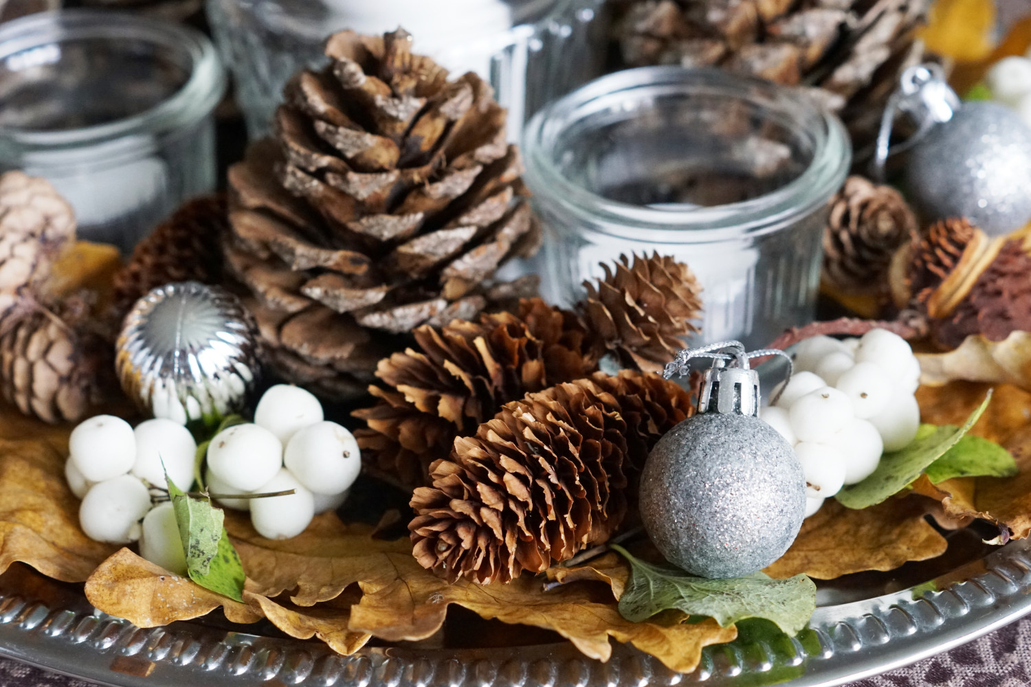 Pynt med vinterbær langs de tørrede blade og placer julekugler og kastanjer tilfældigt mellem grankoglerne.