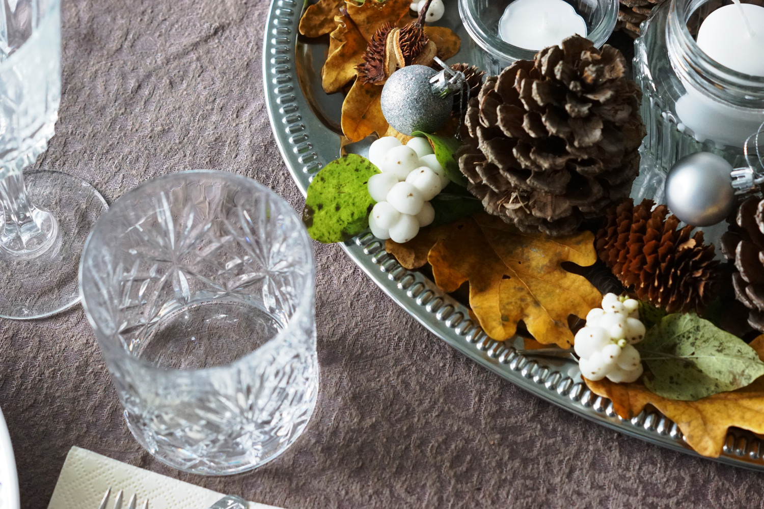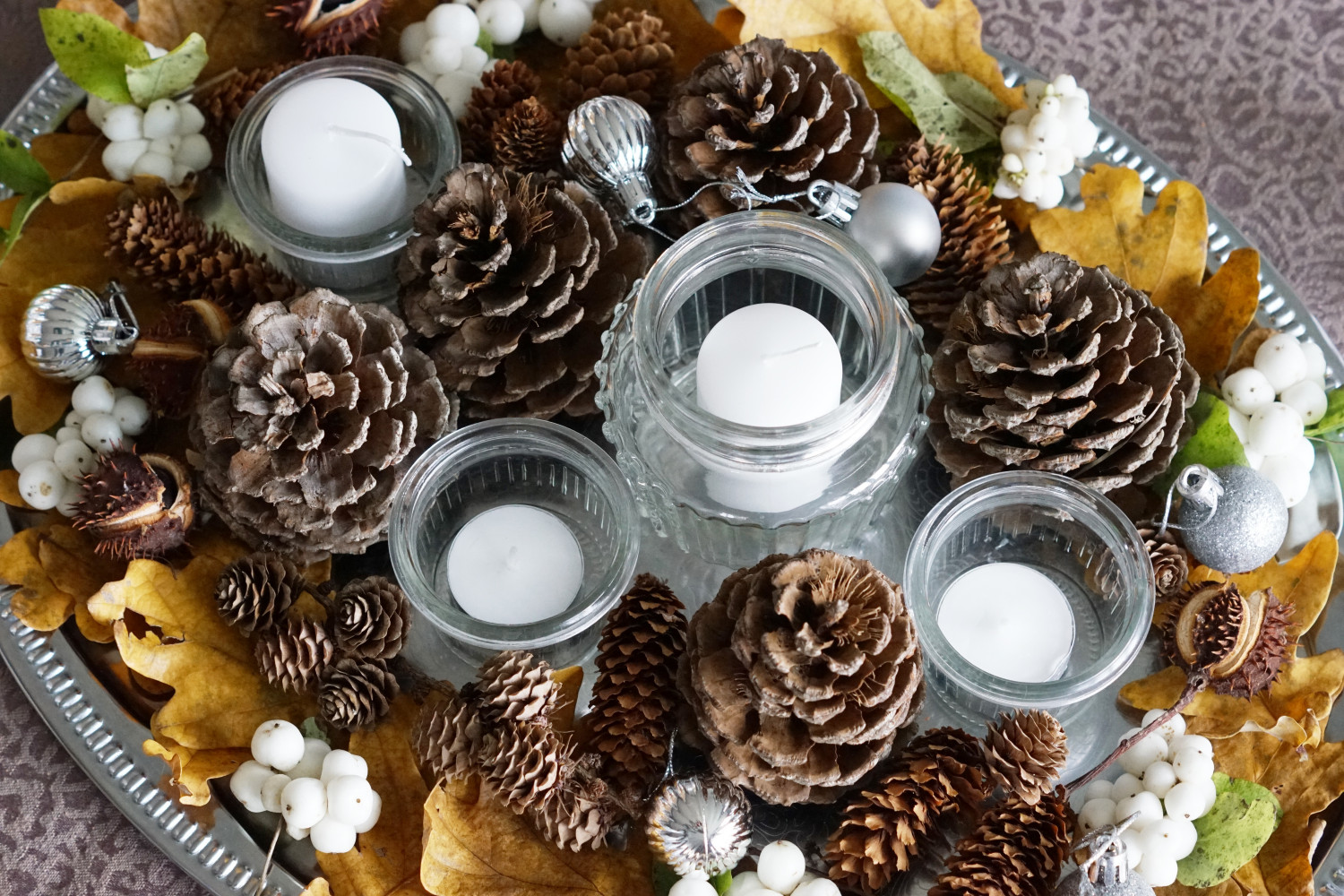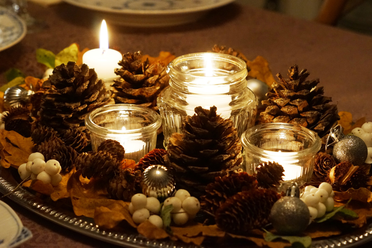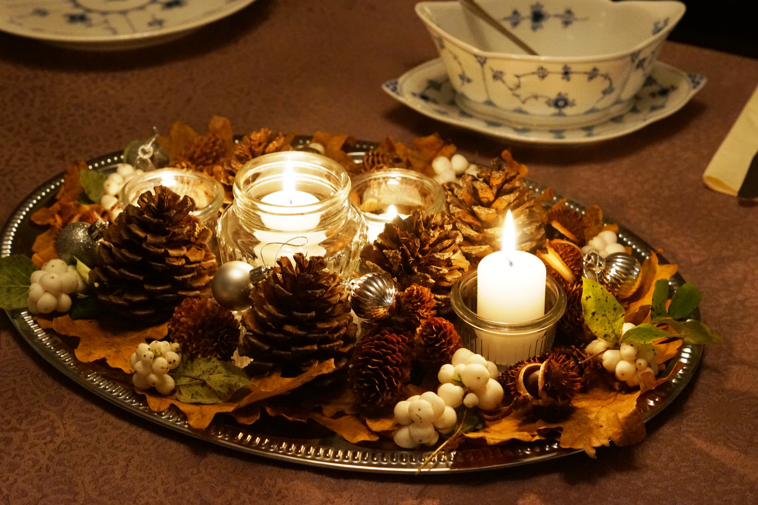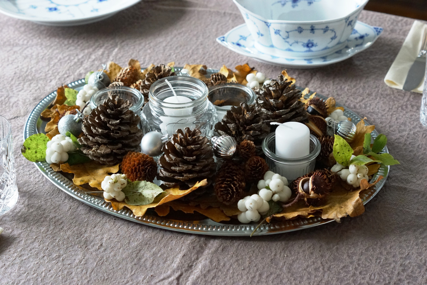 Til denne opdækning har jeg dog gjort noget anderledes og samlet alt pynten på midten af bordet, men dog afgrænset på et fad. Lidt smart – for nu skal lysene bare skiftes ud og så har vi en fin borddekoration helt indtil juledekorationerne tager over.