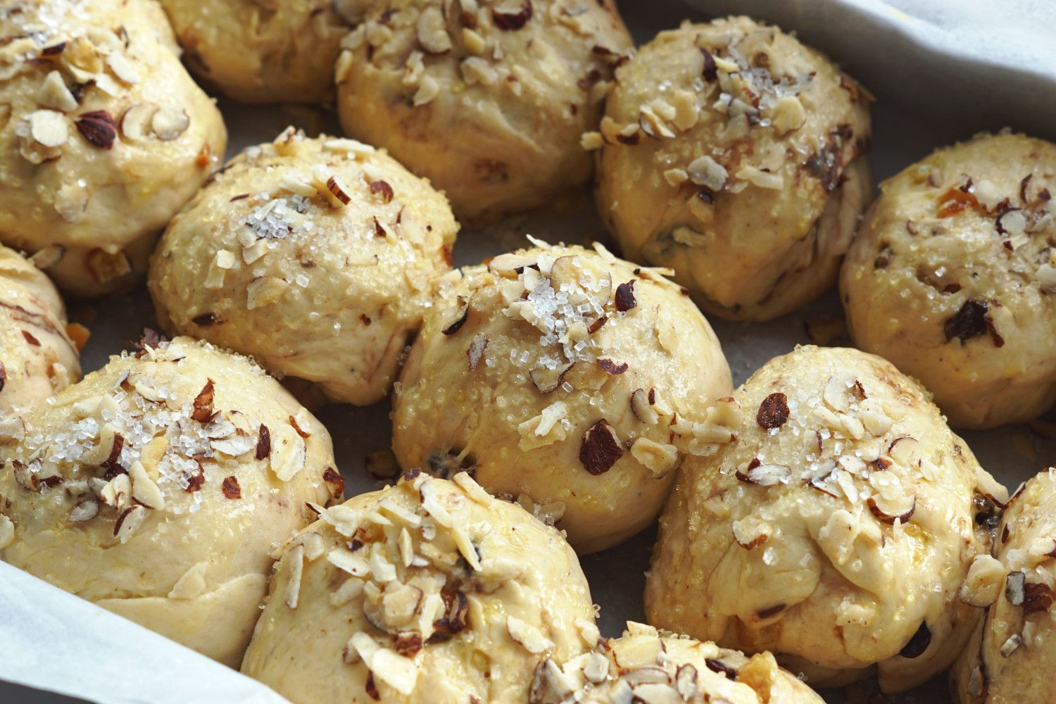 Rul hvert stykke til en bolle og placer dem på række i et firkantet ovnfast fad (størrelse af en halv bradepande – bager du dobbelt portion kan du bruge en dyb bradepande). Lad der være 1-2 cm mellem hver bolle og fyld fadet ud.