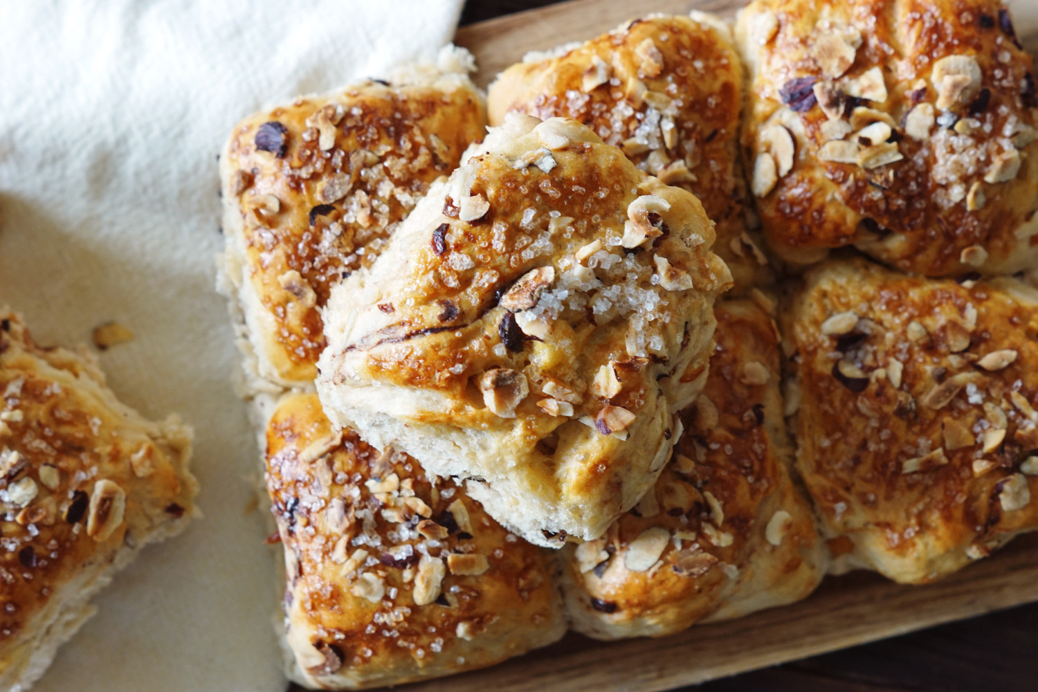 Her får du min opskrift på de lækreste bløde og svampede juleboller UDEN sukat, men i stedet med appelsinskal, mørk chokolade og rosiner samt hasselnøddeflager og perlesukker på toppen.