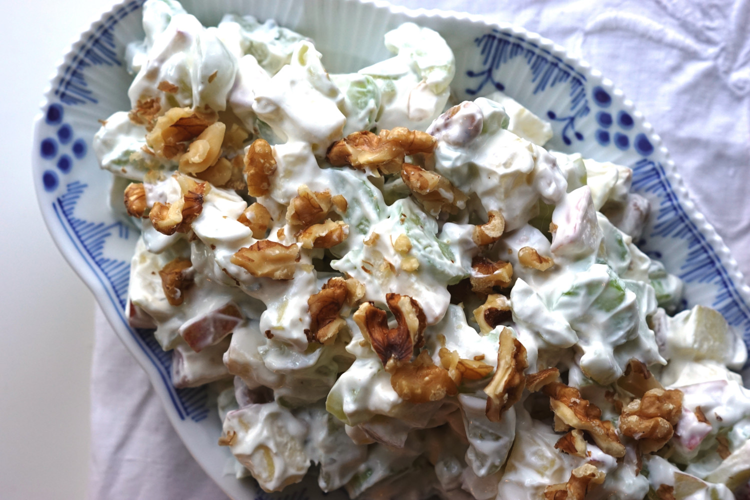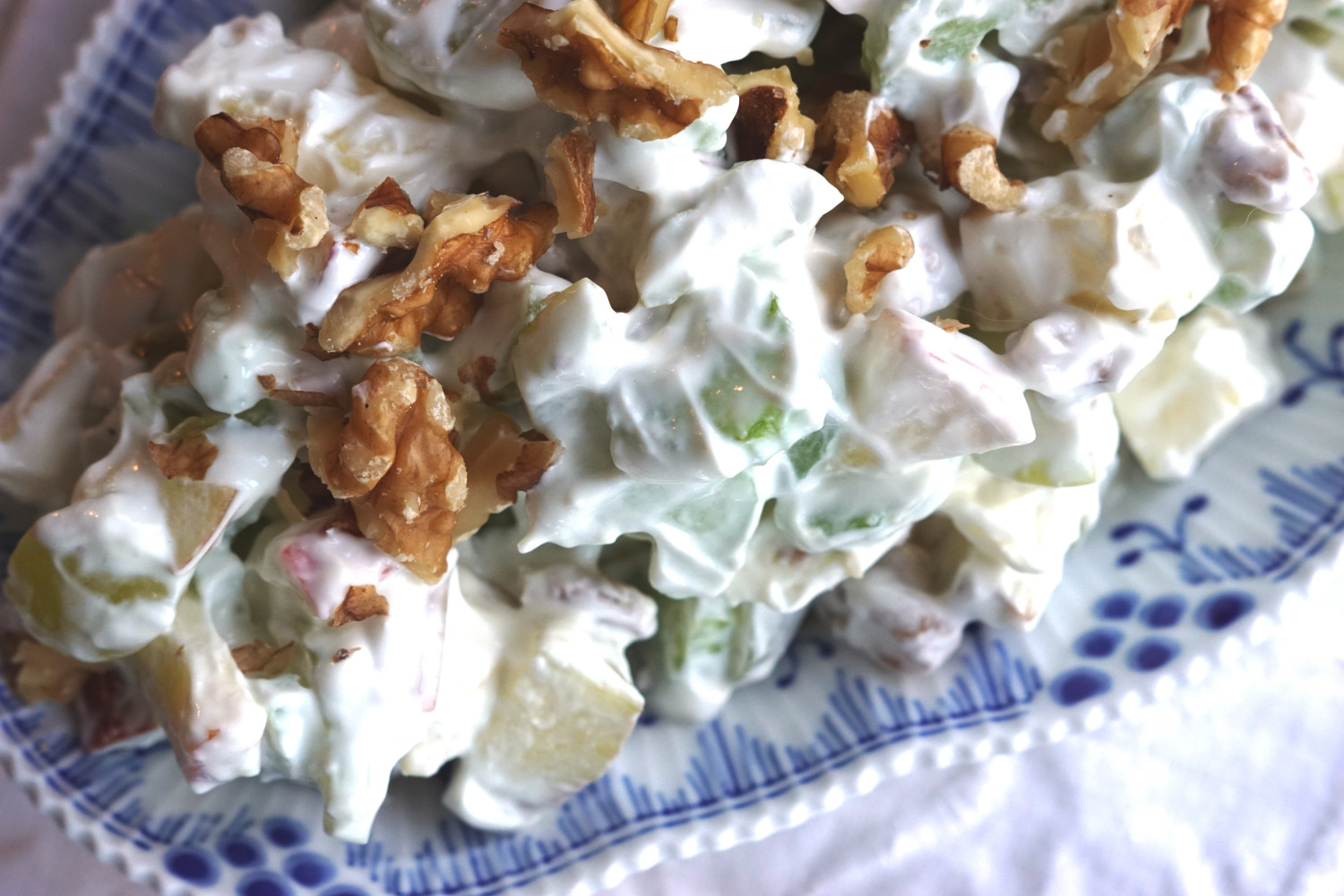 Der er sket lidt siden. I Danmark forbinder vi hvert fald salaten med, at der også er sprøde vindruer og knassende valnøddestykker i. Og så er mayonaisen blevet udskiftet med noget lidt lettere; i nogle opskrifter cremefraiche der vendes med flødeskum.