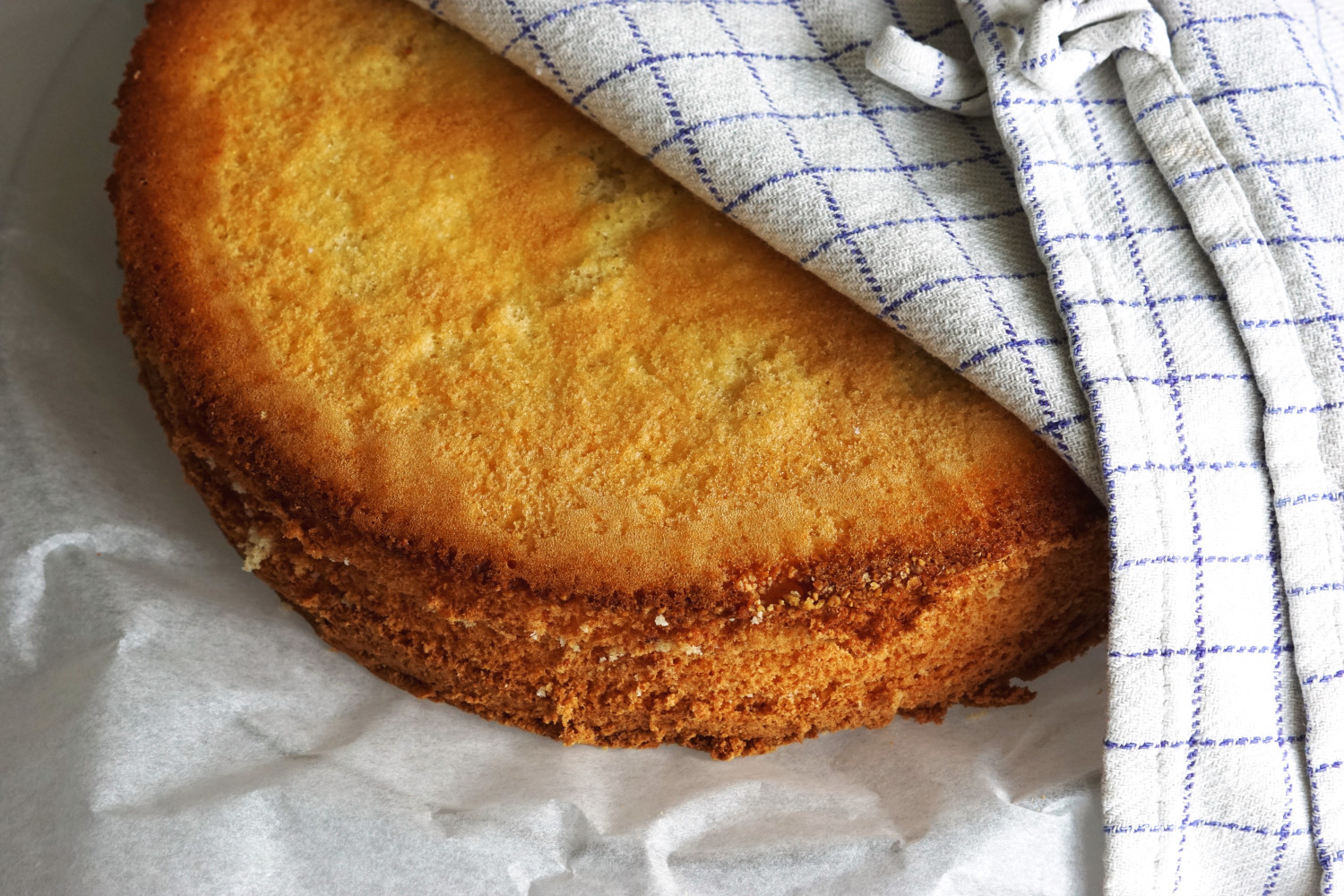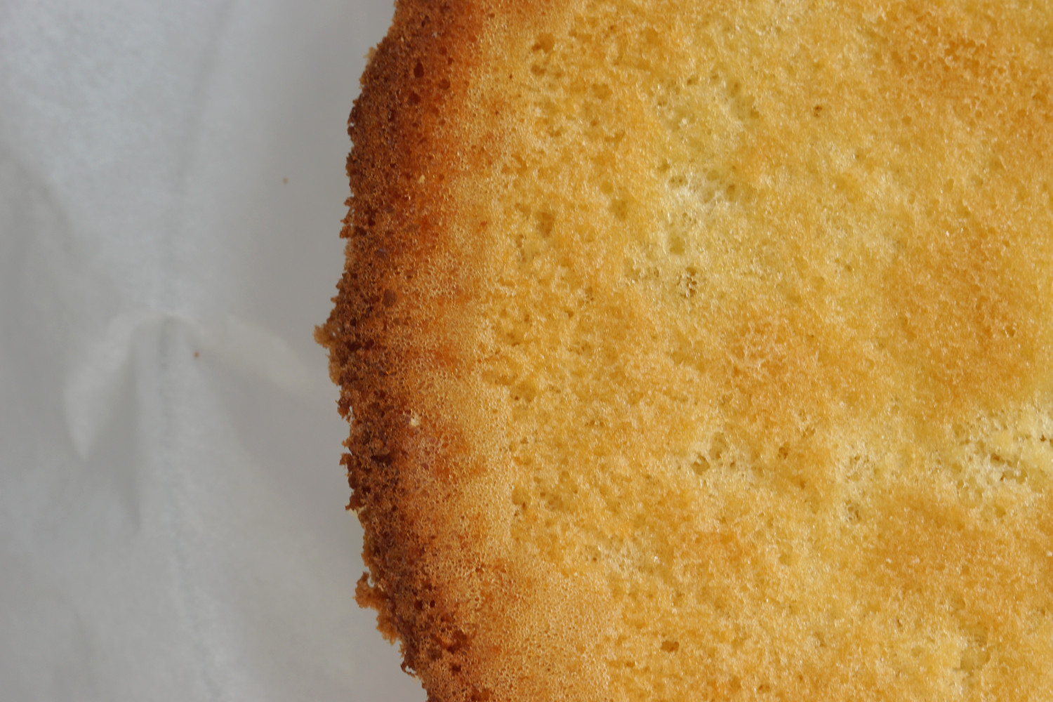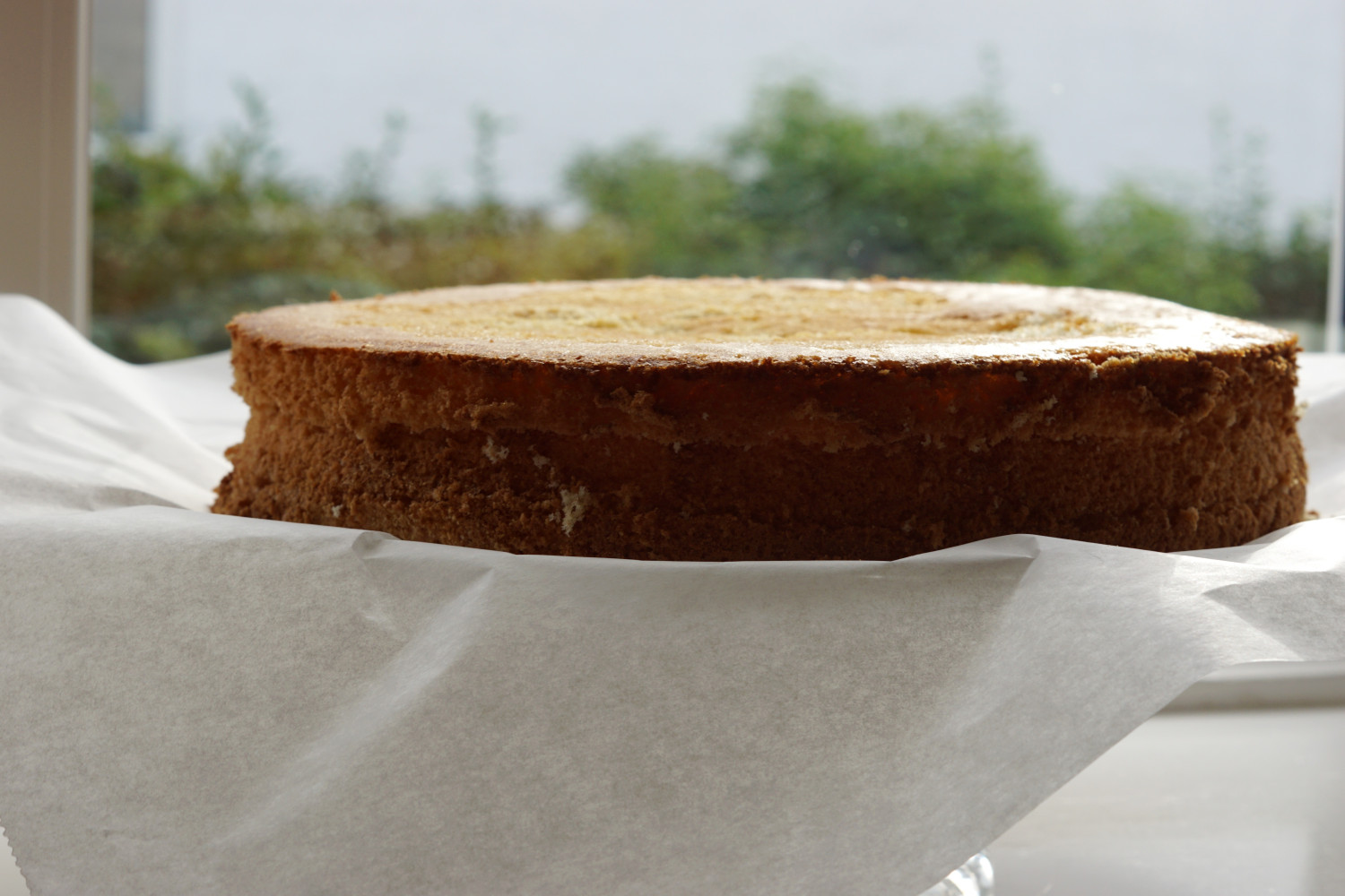 Gentag dette på midten af det sidste stykke af kagen. Herefter har du tre lagkagebunde. Bunden befries forsigtigt fra bagepapiret ved at vende den på hovedet, så bagepapiret vender op. Træk det forsigtigt af.