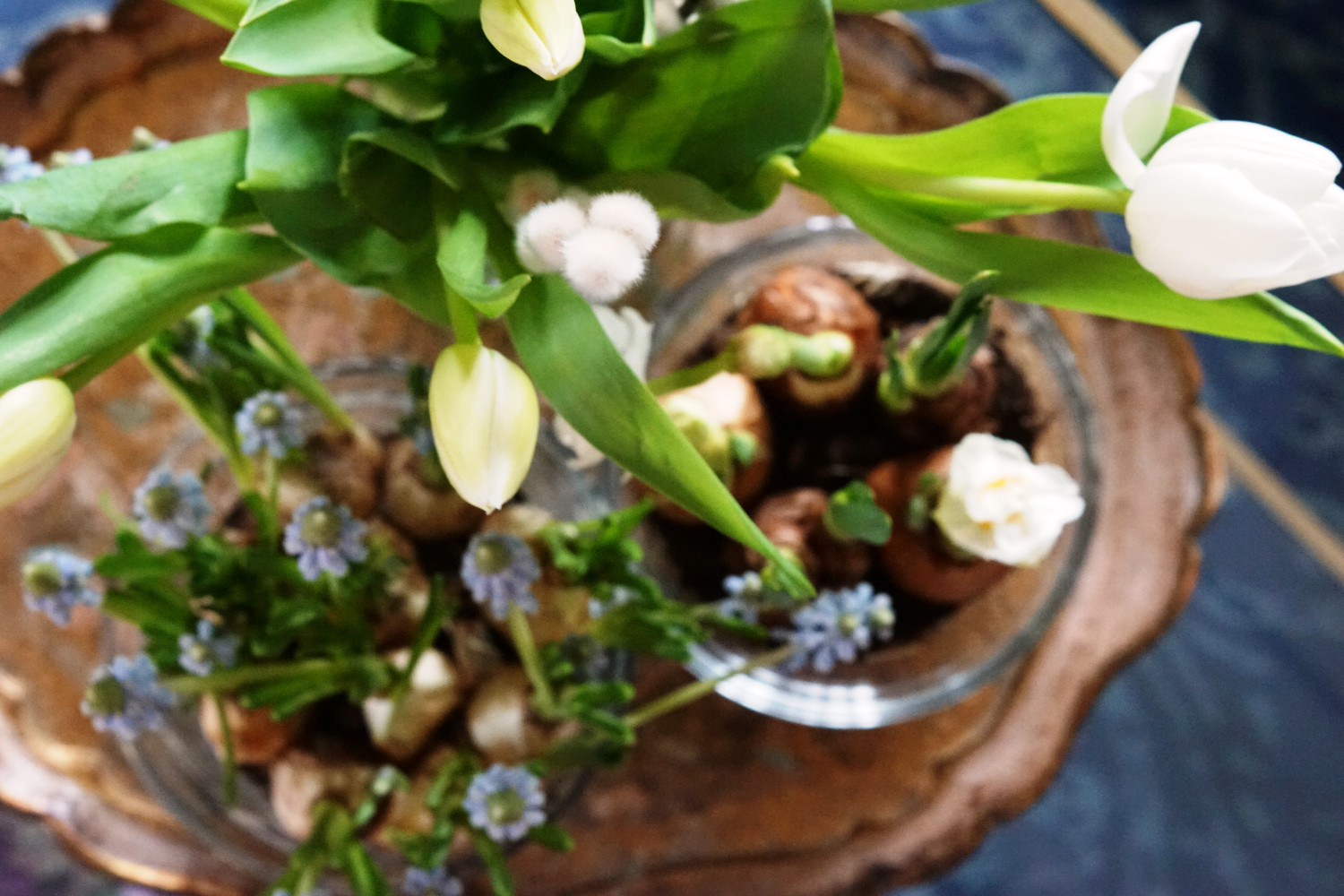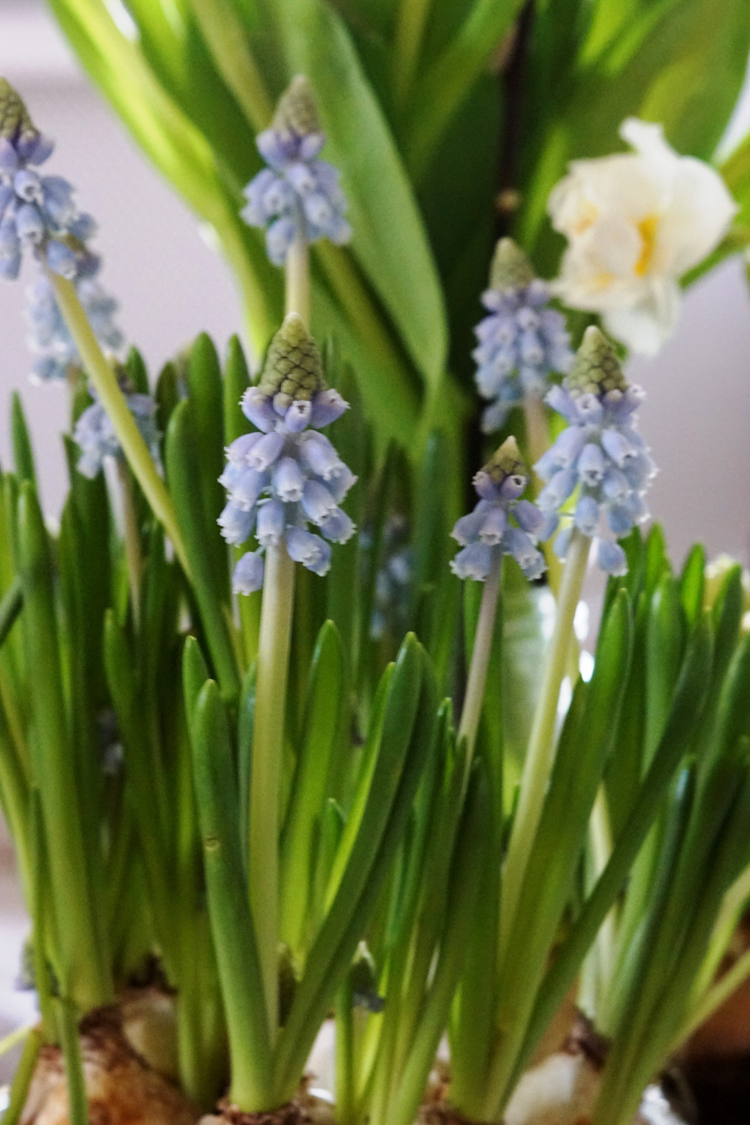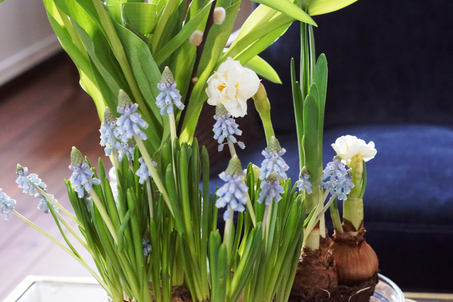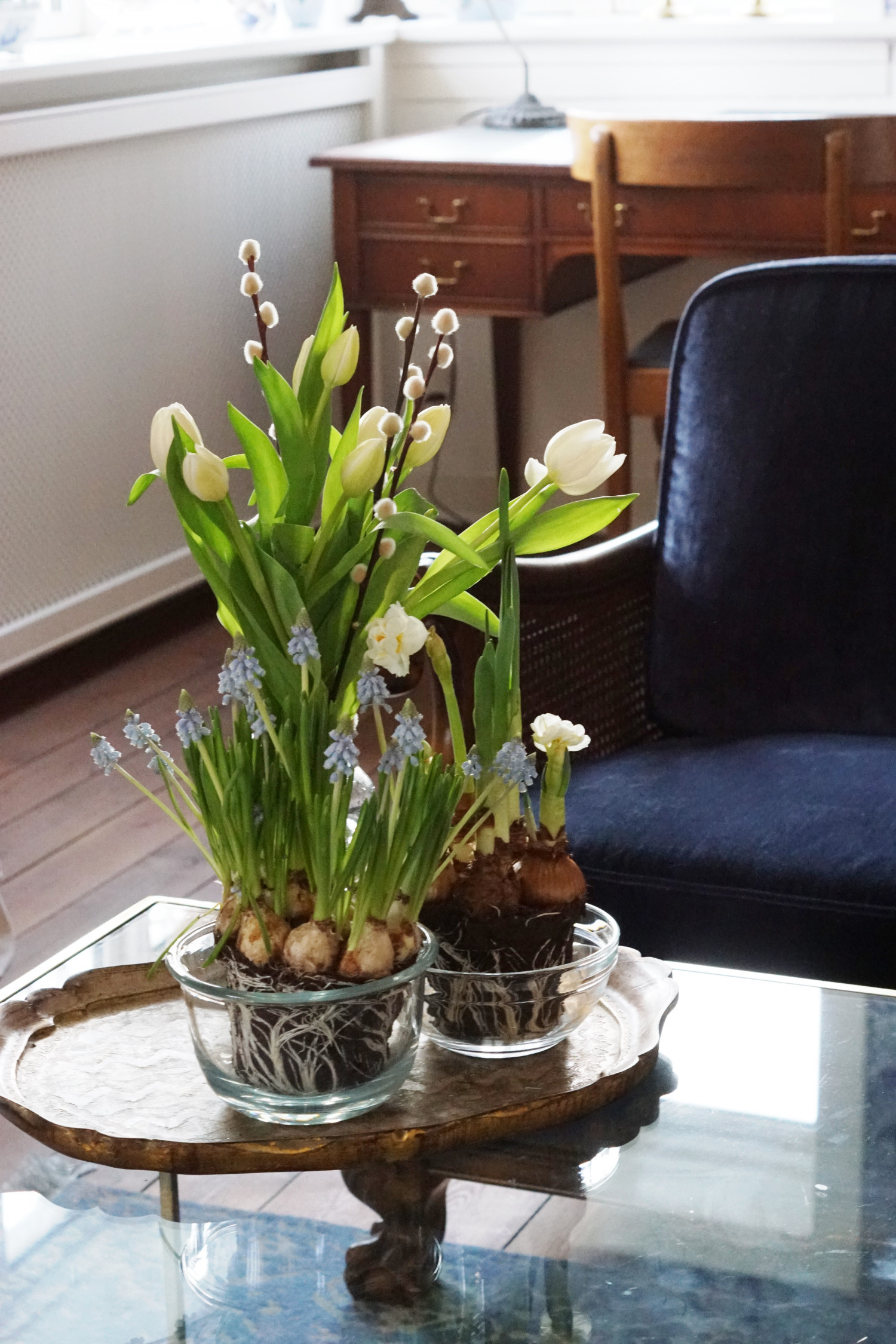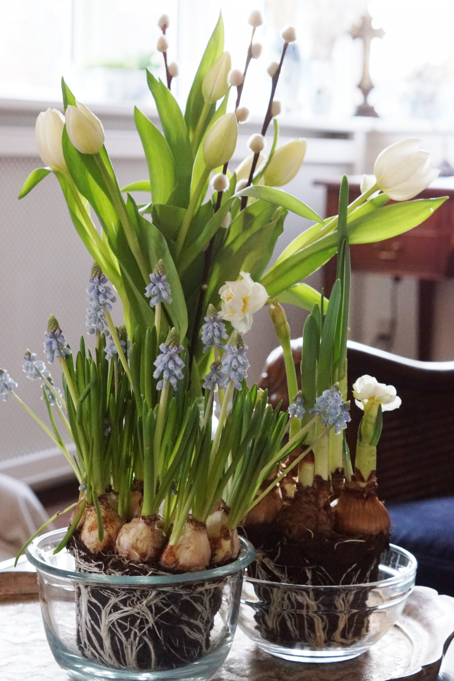 Her er det fine blå perlehyacinther, hvide påskeliljer (begge stående med løg) og afskårne tulipaner og pilegrene. Og jeg nyder at se løgplanterne springe ud inde i min stue.