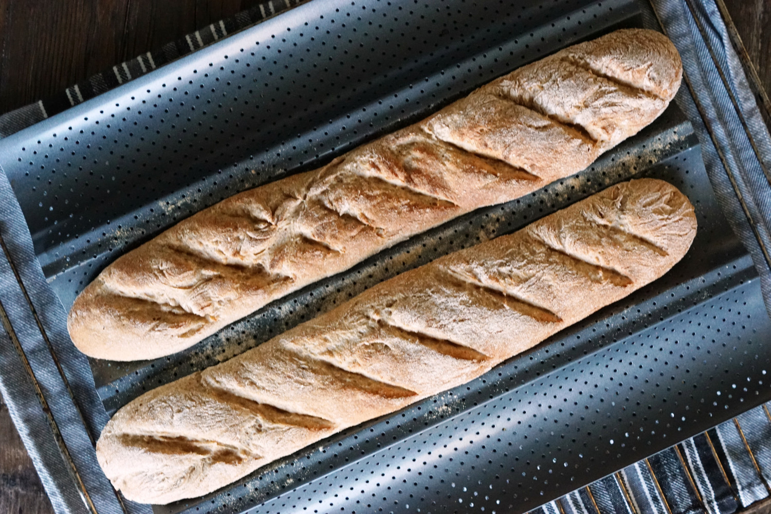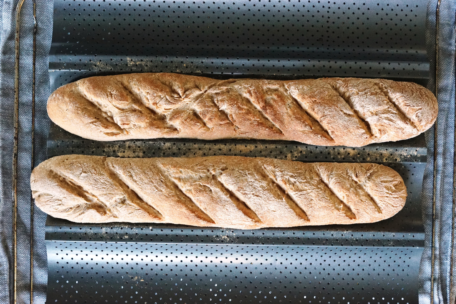 Placer dine baguettes på en bageplade og dæk med viskestykke. Lad dem efterhæve på køkkenbordet i 30-40 minnutter, til du synes de har en flot størrelse. Snit dem så med en skarp kniv og bag dem i en forvarmet ovn ved 210 grader varmluft i 12-16 minutter. Hold øje med dem – ovne er forskellige.
