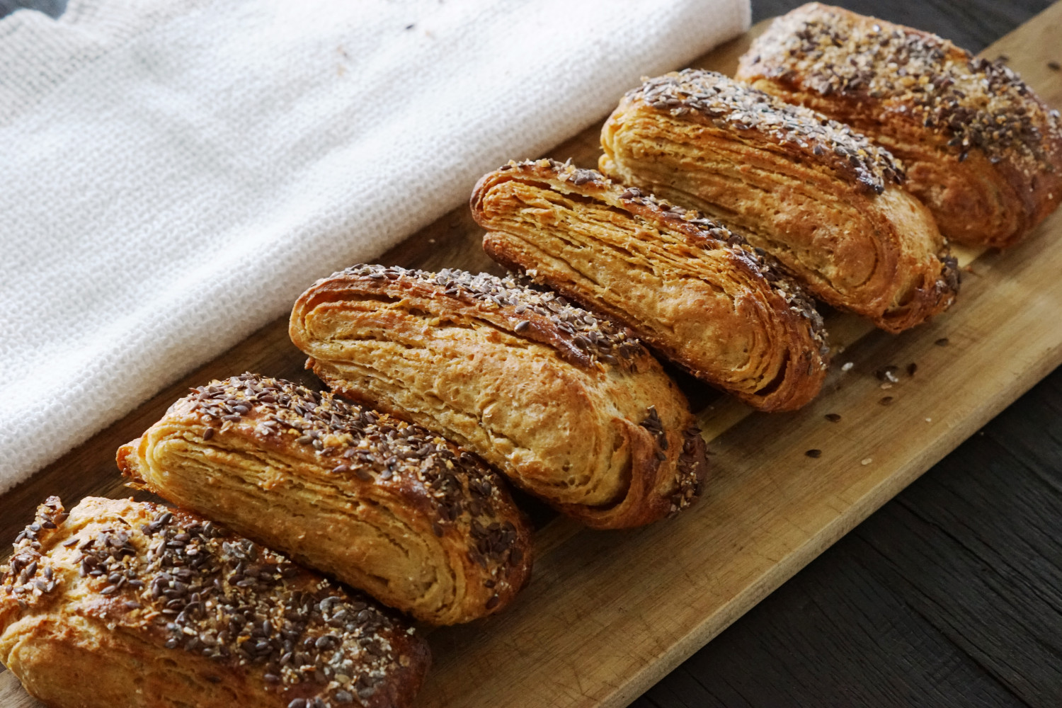 Når alt smørret er fordelt efter ovenstående fremgangsmåde ruller du igen dejen ud til et rektangel – igen på ca. 25 x 40 cm. Fold dejen i tre lag fra den brede side og ind, så du har et langt dejstykke du kan skære birkes af . Rul ganske forsigtigt (med et let tryk) på dejen med en kagerulle, så den flades en lille smule ud. Placer dejstykket på et spækbræt og dæk med husholdningsfilm og et viskestykke.