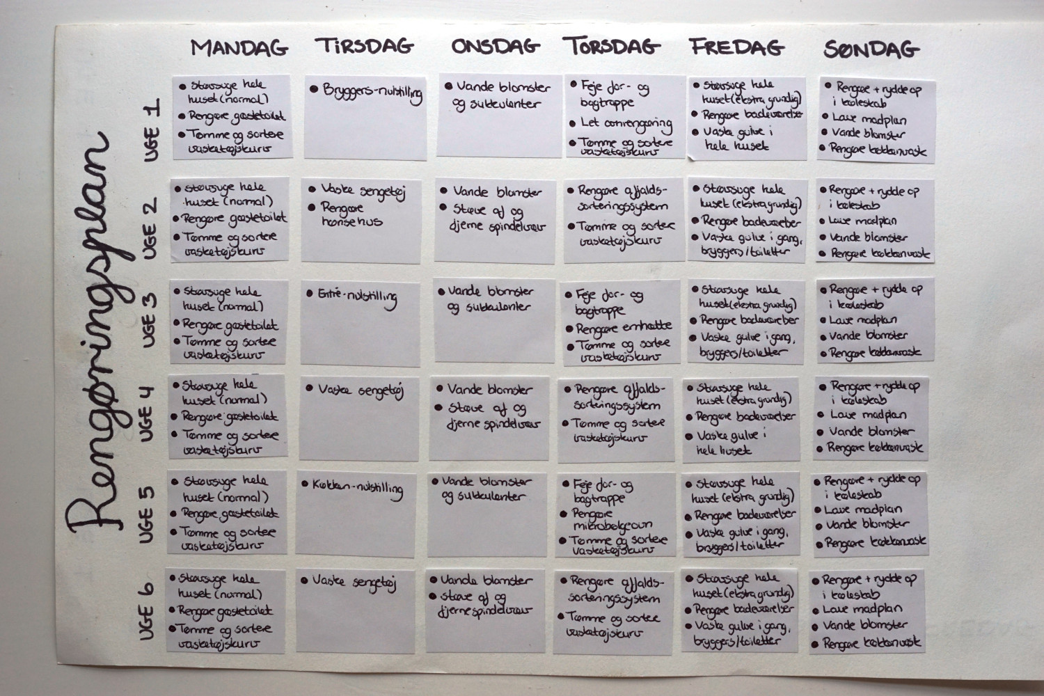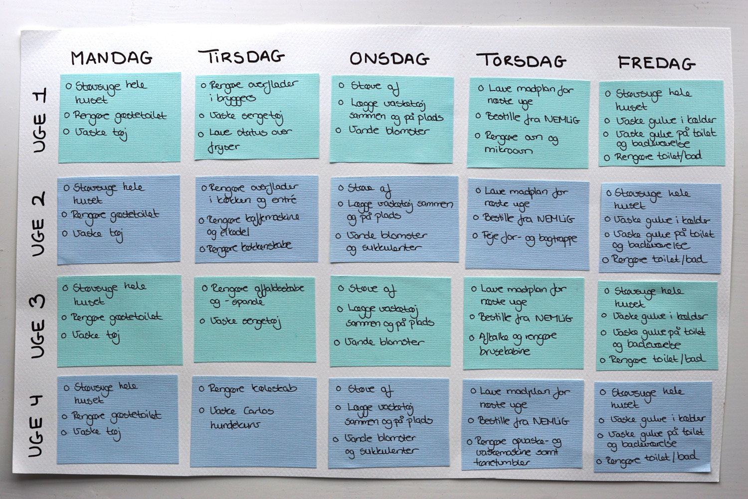 Min plan er bygget op omkring støvsugning af huset. Det gør jeg mandag og fredag, og så har jeg derfra fyldt opgaver ind på de øvrige dage. Der er naturligt nok nogle opgaver der går igen hver uge, og så er der nogle jeg kun gør hver 2. eller 4. uge.