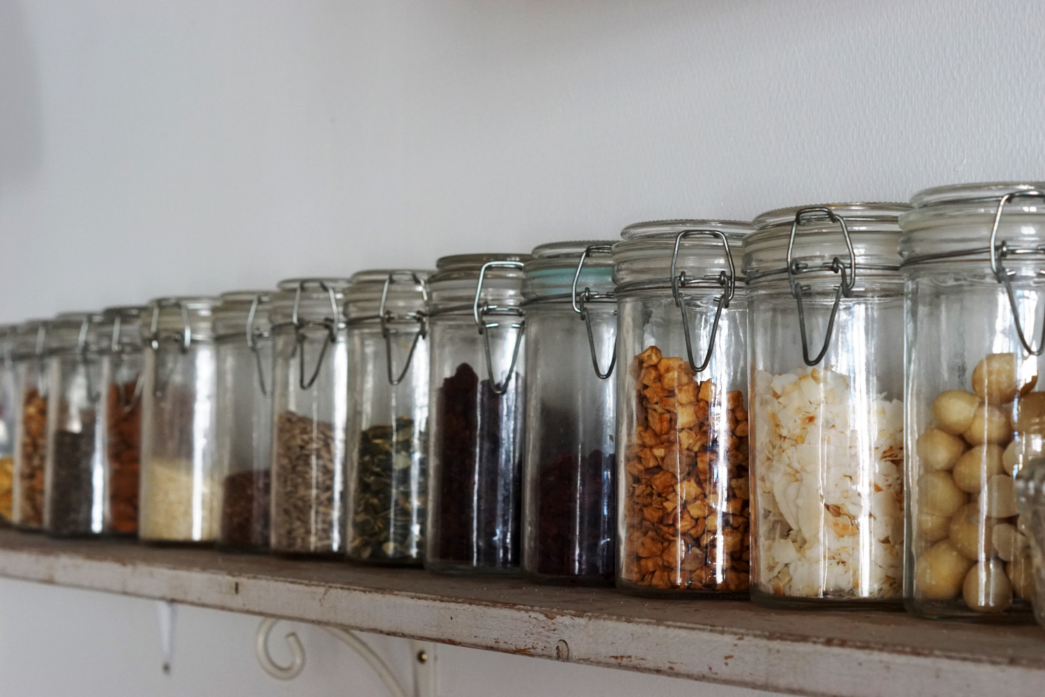 På en lang hylde over det køkkenbord jeg mest arbejder ved, har jeg alle disse glas stående med nødder, tørrede bær og andre “snack”-agtige ting. Det gør det nemt at få alle disse lækre og sunde ting ind i vores daglige måltider. For tiden har jeg glas med bananchips, valnødder, chiafrø, mandler, sesam, hørfrø, solsikkefrø, græskarkerner, rosiner, tranebær, gojibær, tørrede æbletern, kokosflager og macadamianødder. Det varierer lidt hvad jeg fylder i disse glas, men fælles for dem er, at tingene både bruges i bagværk, men i særdeleshed også på morgengrød, til müsli eller i salater. Jeg rækker til hverdag ud efter de her ting som topping på havregrød eller smoothie. Her har jeg ingen mærkater på. Det giver nemt sig selv, hvad der er i, og så er de nemmere hurtigt at give en tur i opvaskemaskinen, når de er tomme (inden de fyldes på ny..). Det er min erfaring, at det her er ting, man rigtig nemt glemmer man har. Man køber måske lige en pose tranebær til en salat man skal lave, og så ryger posen med resten ind i et skab og bliver glemt. Det undgår man sådan her.