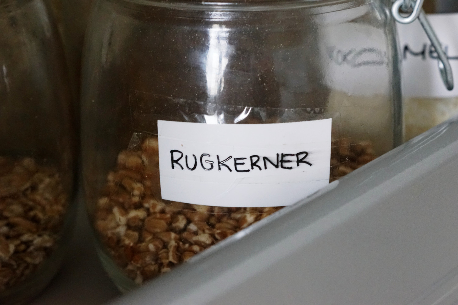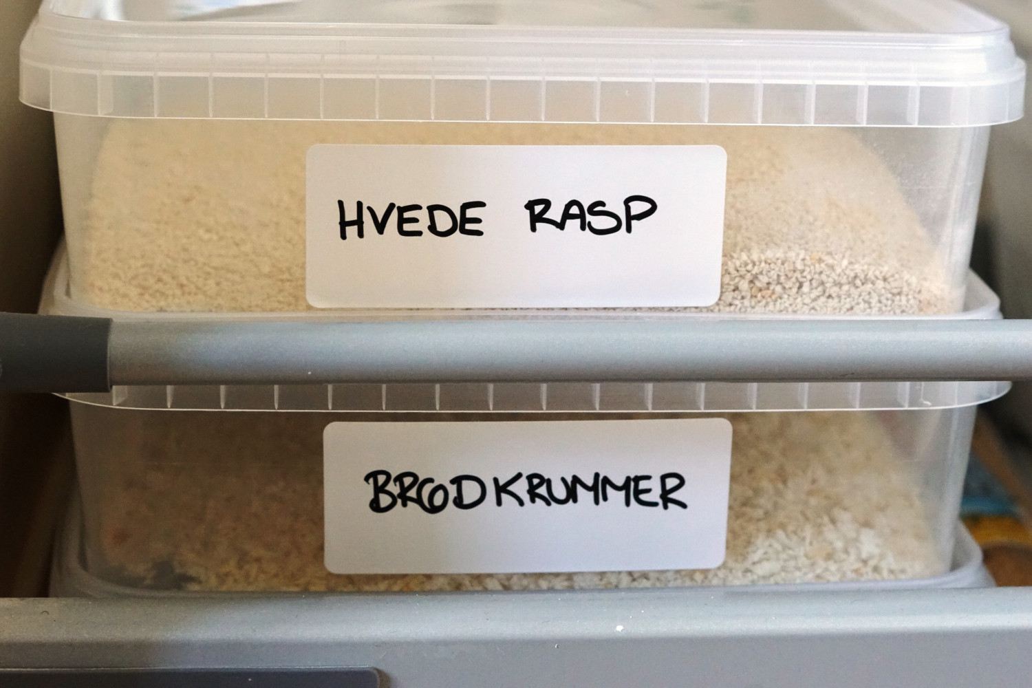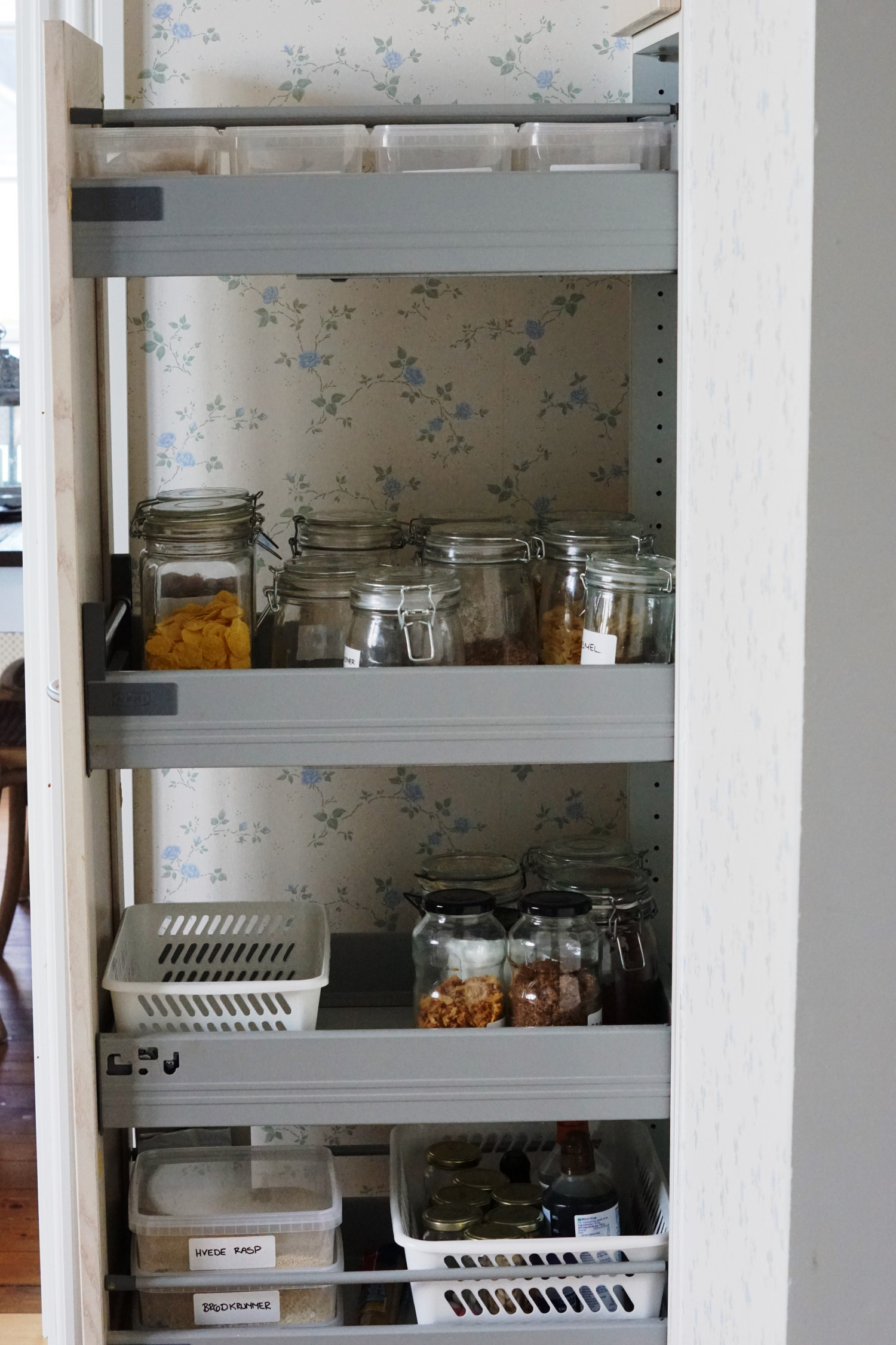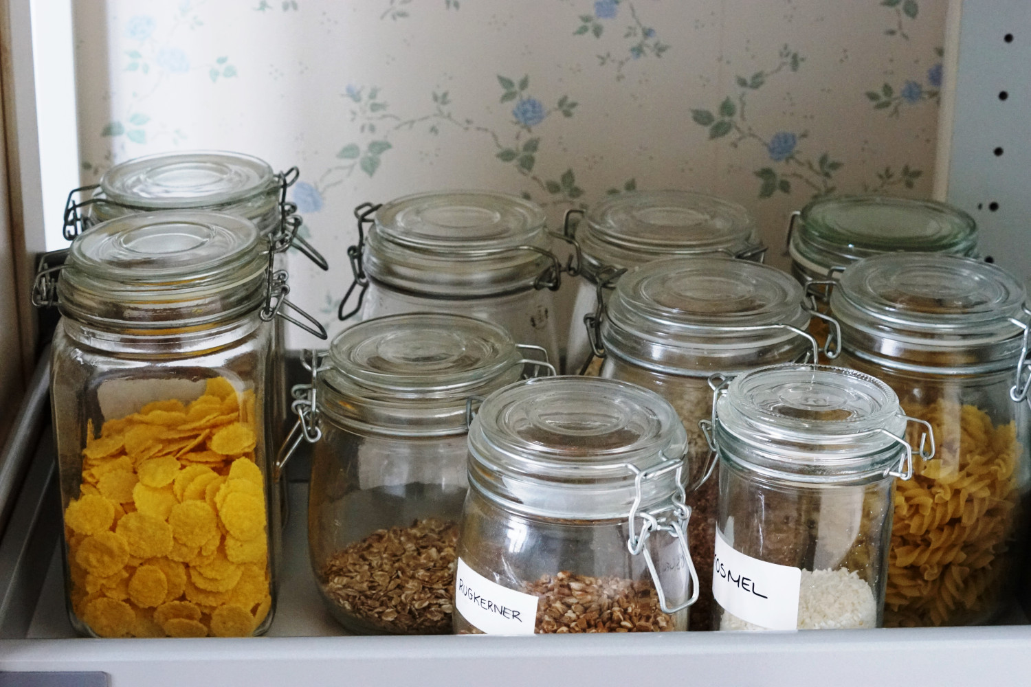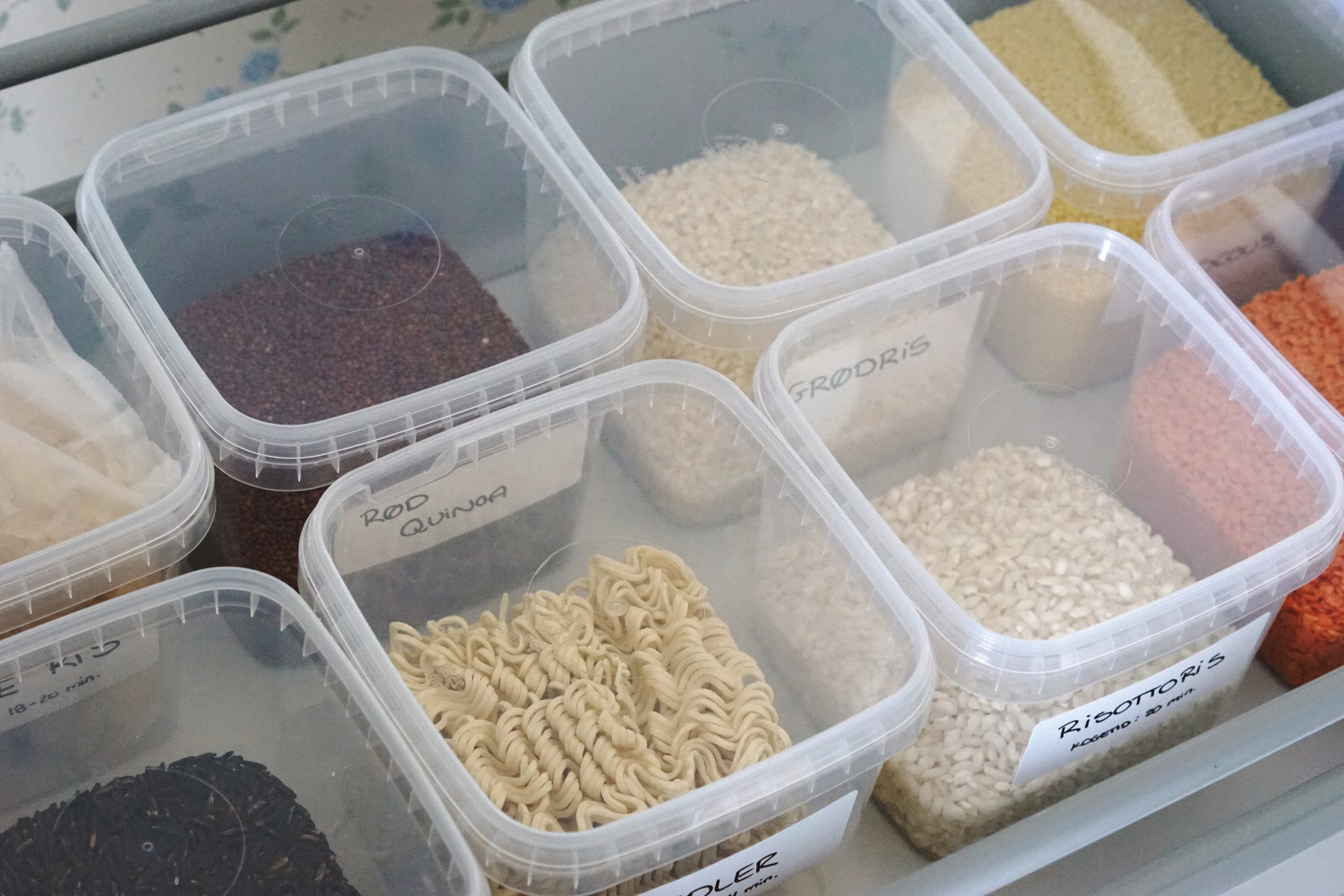 Morgenmadsprodukter, grovere kerner, pasta, ris, linser osv. har jeg stående i et træk-ud-skab i skuffer. Alt opbevares i lufttætte plastikbokse eller glas. Her med mærkater på.
