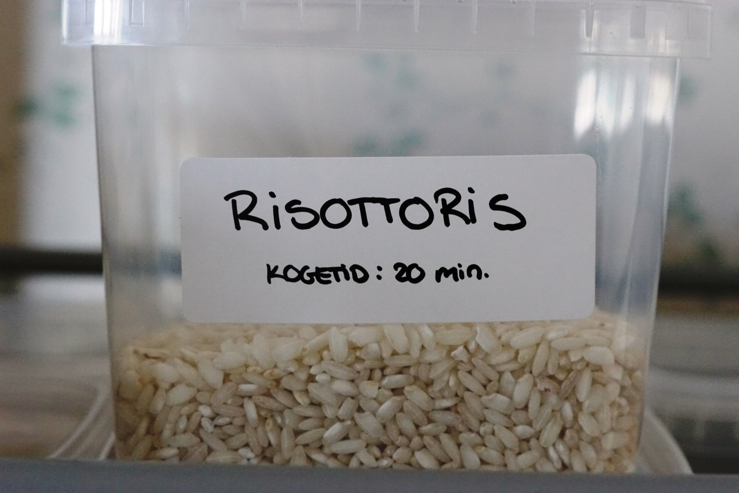 Lav mærkater til dine ting ved at bruge klistermærker eller klippe nogle papirlapper ud som du skriver på og taper på. Det sidste er lidt mere omstændigt, men er nemmere at fjerne igen. På mærkaten kan du også tilføje en “mindst holdbar til” dato eller hvor lang vejledende kogetid ris eller andet har.