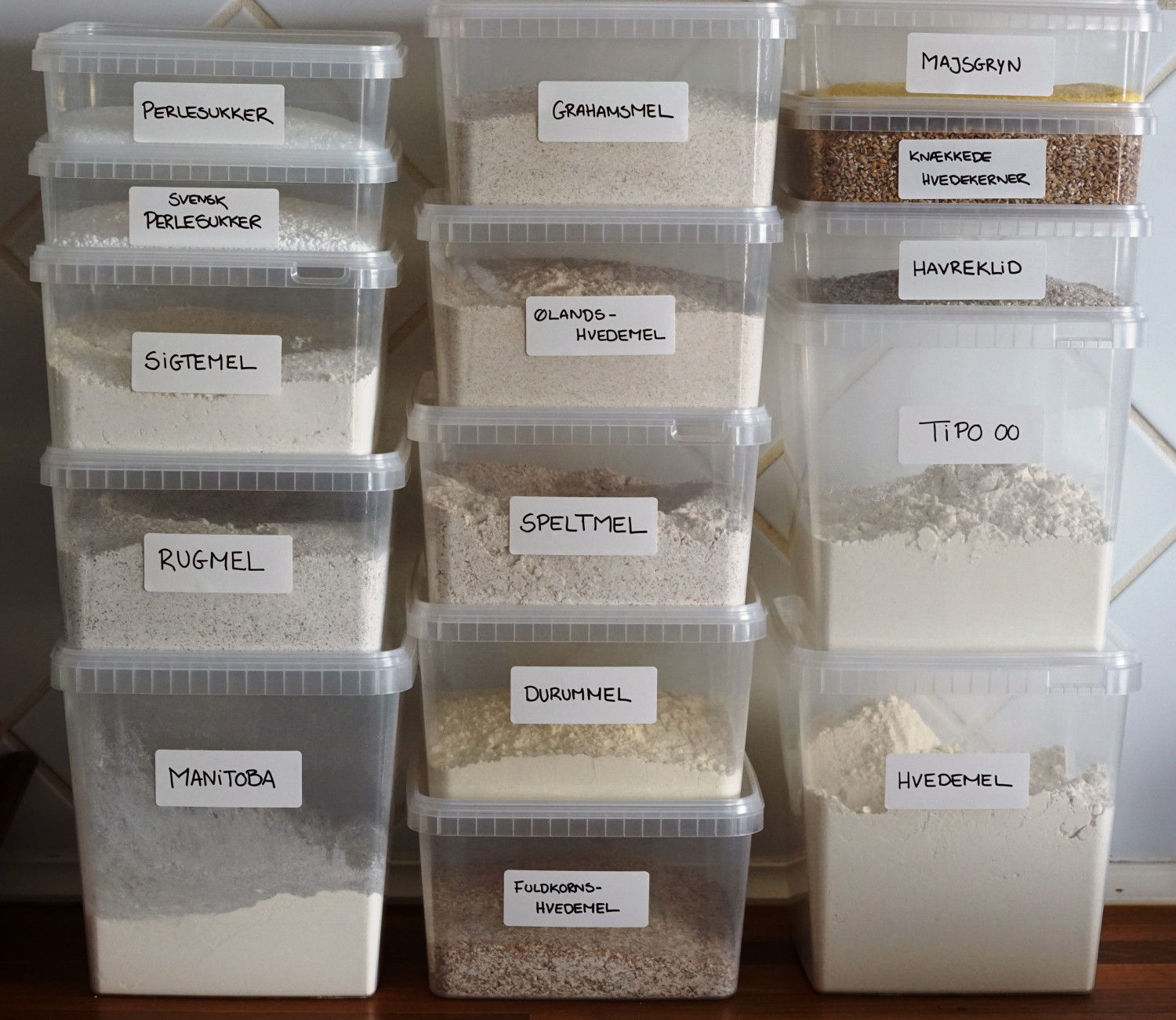 Hvedemel, TIPO og Manitobamel køber jeg i 2kg poser og det opbevarer jeg i 5 liters bokse.