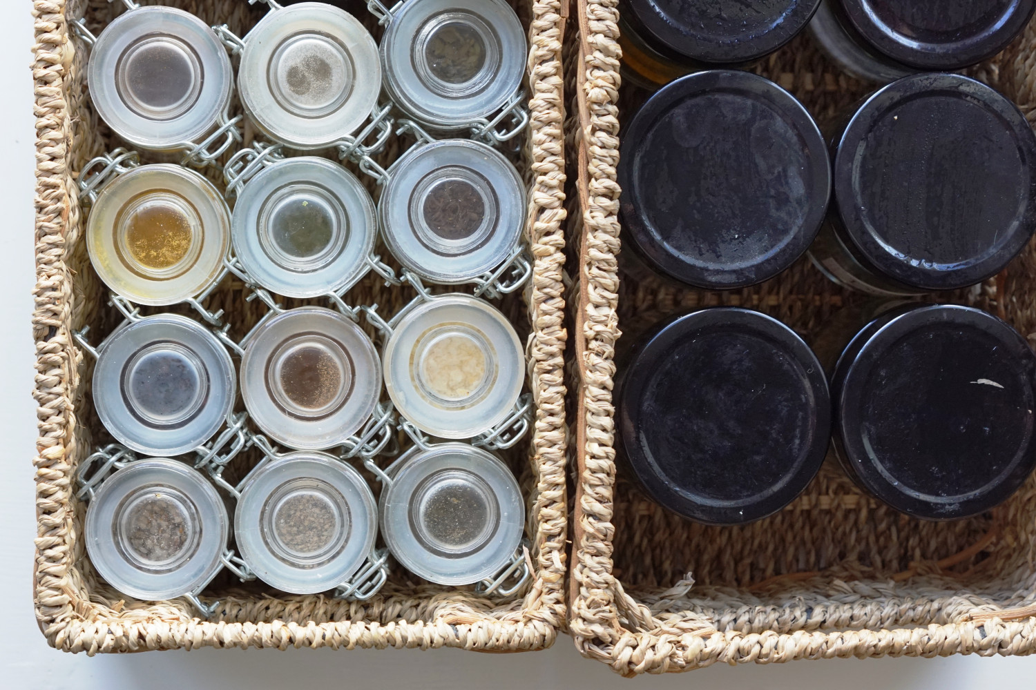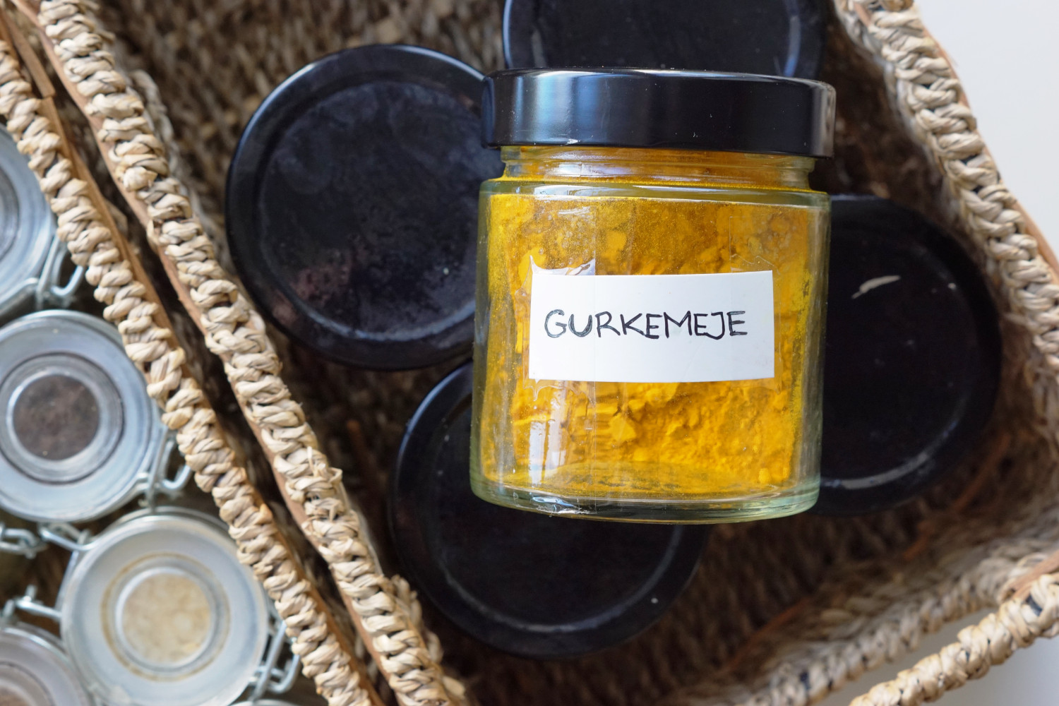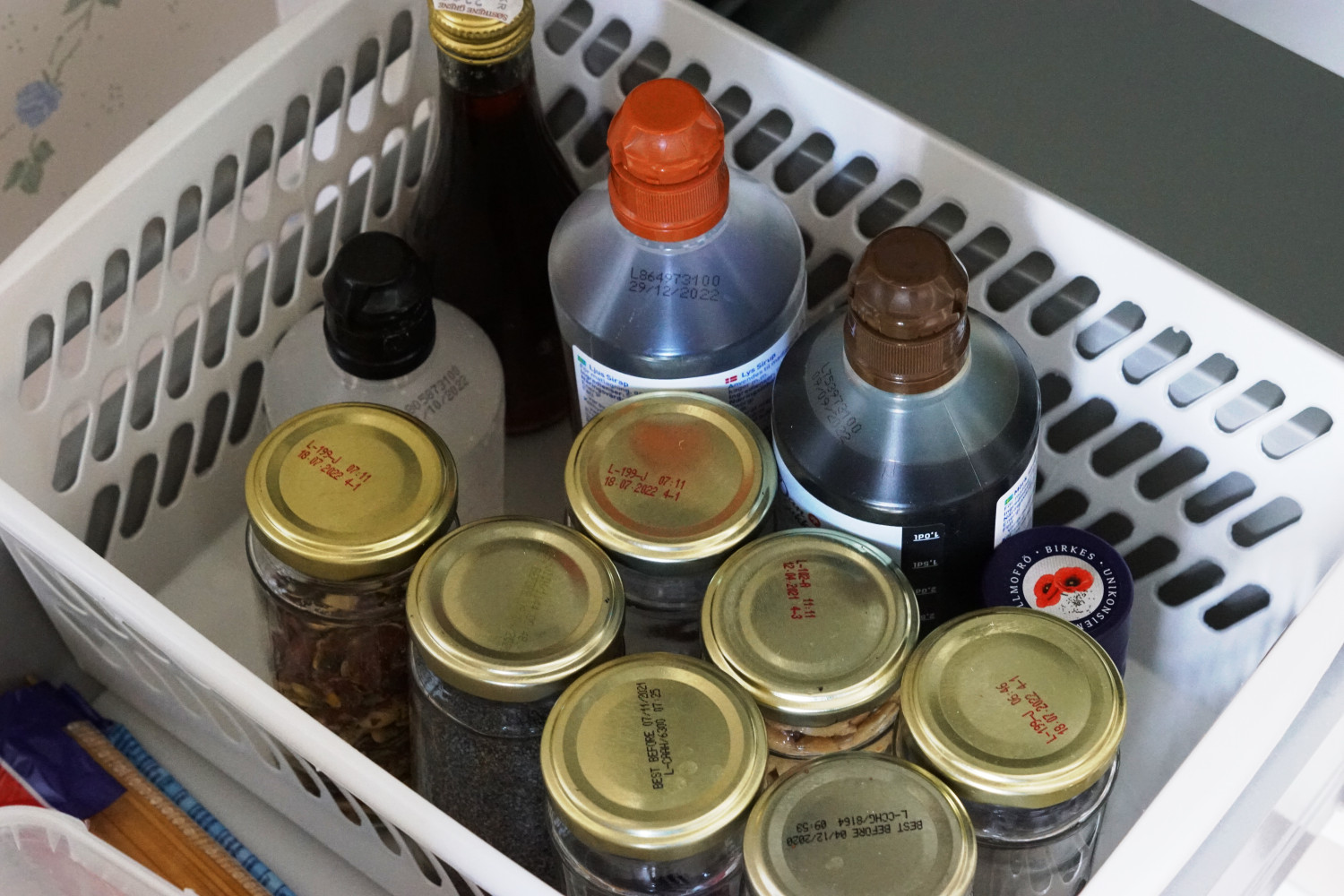 Krydderier opbevarer jeg i små patentglas jeg har købt i Søstrene Grene. Jeg har også nogle gamle syltetøjsglas jeg bruger til krydderier (dem med sorte låg herunder). De er større, hvorfor de passer perfekt til krydderier man ofte har I lidt større mængder. Hjemme hos mig er det f.eks. oregano, kanel, gurkemeje og dild.