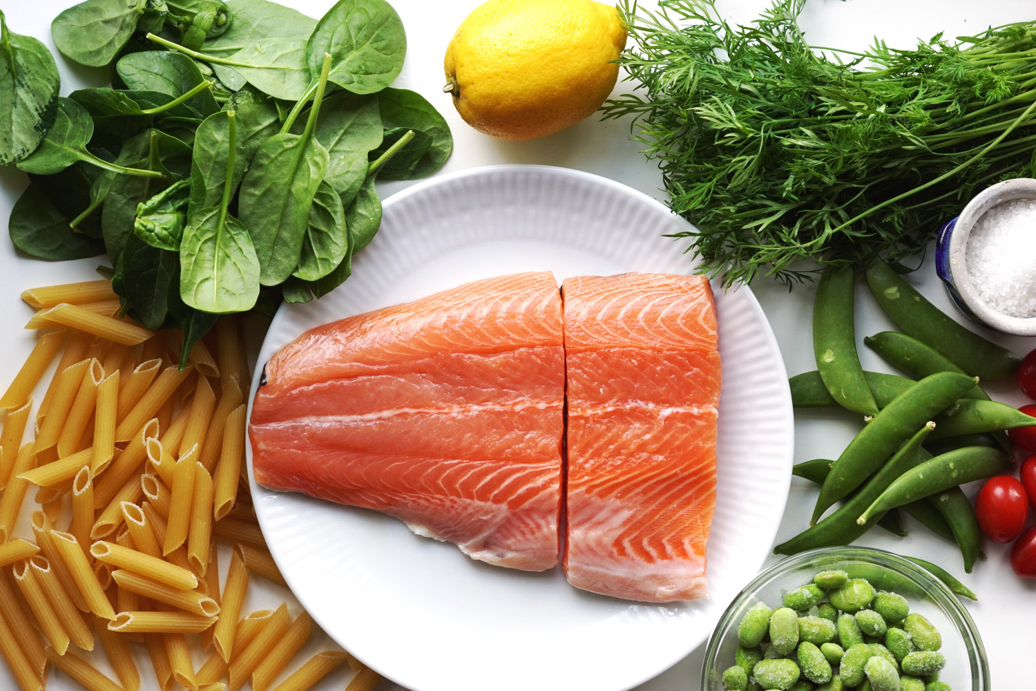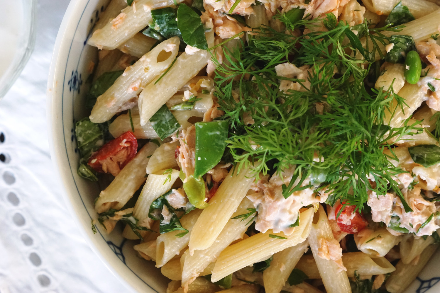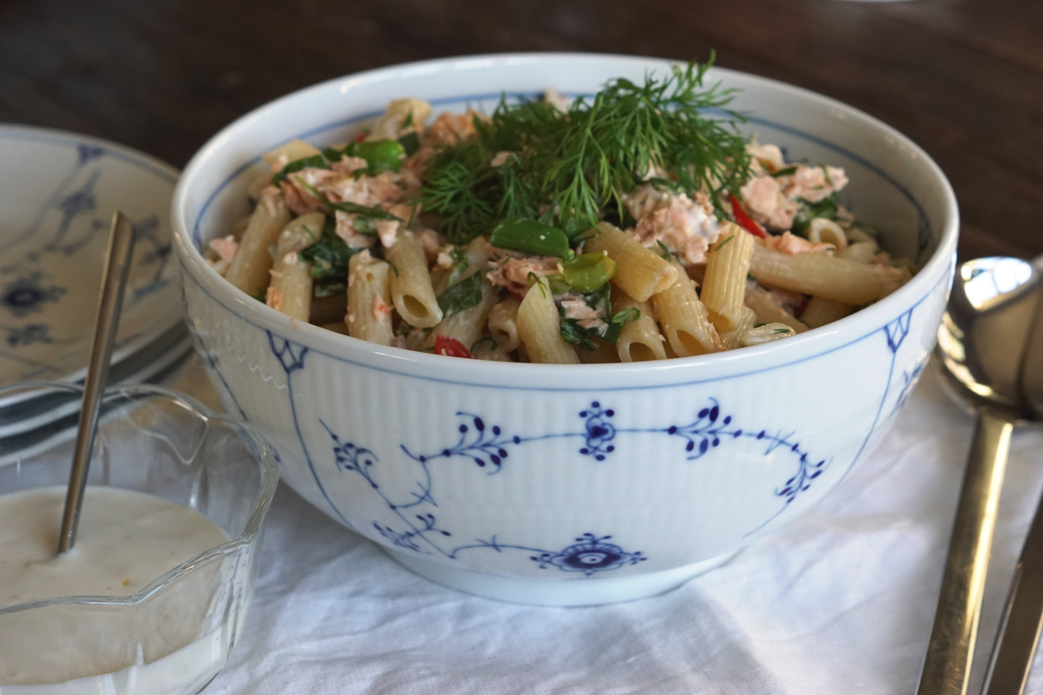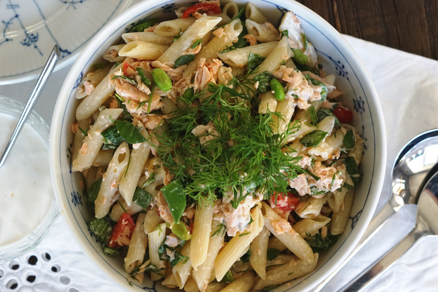 Hjemme hos os skal der helst fisk på madplanen én gang om ugen, og det er af og til denne meget børnefamilie-venlige pastasalat med laks.