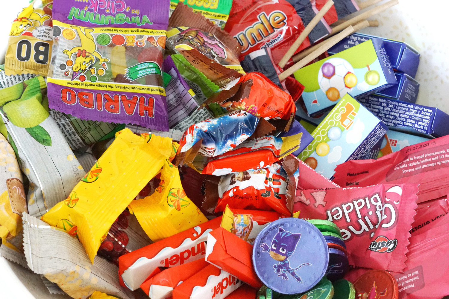 Jeg køber gerne forskelligt slik og snacks som er pakket ind; små vingummiposer, chokoladeknapper i æsker, små müslibarer og dadelstænger mv.