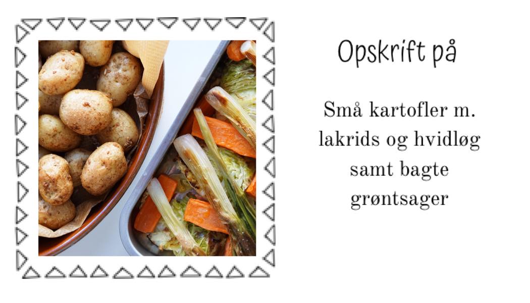 Du skal ikke lade dig skræmme af lakrids-hvidløgskartoflerne – de smager FANTASTISK til lammet, som har en meget markant smag. De bagte grøntsager står også godt til og så foreslår jeg to salater til din påskemiddag: en waldorfsalat og en sprød salat med pære, blåbær og lemonmarinade, som kombinerer sødme og syrlighed på lækreste vis.